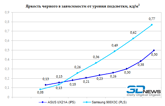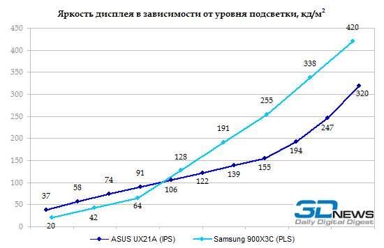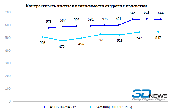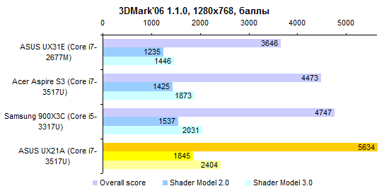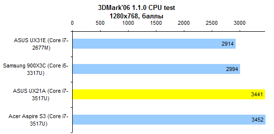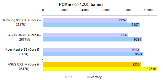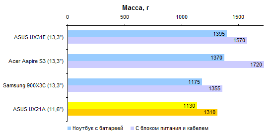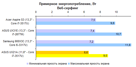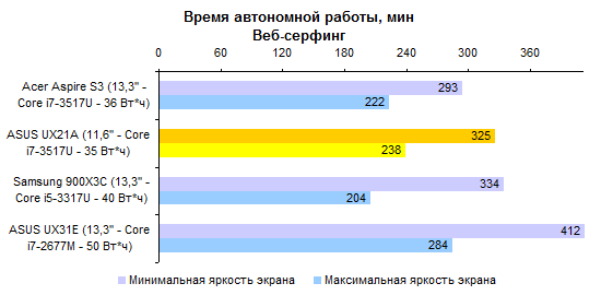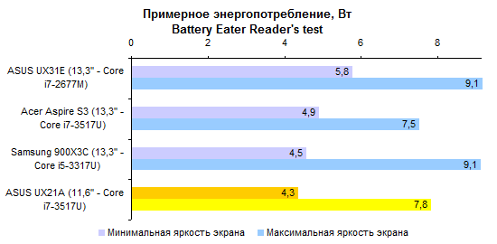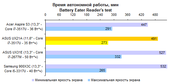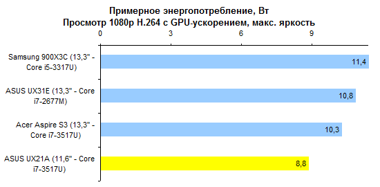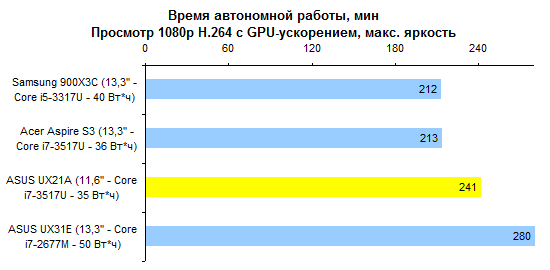 По производительности Core i7-3517U примерно соответствует прошлогодним процессорам для полноразмерных ноутбуков. Так что переживать о нехватке вычислительной мощности определенно не стоит — это далеко не нетбук и даже не ультрабук начального уровня.   Что интересно, в данном случае производительность графической составляющей процессора заметно выше, чем у остальных ультратонких ноутбуков на Ivy Bridge, которые мы успели протестировать.  Памятуя о том, что в такого рода устройствах производительность графики упирается не в возможности кремния, а в производительность системы охлаждения (ключевое слово: Turbo Boost), мы можем сделать вывод о весьма удачной реализации оной системы в ASUS UX21A. Эффективность достигнута не в ущерб комфорту — ультрабук очень тихий. ⇡#Тестирование — масса, время автономной работыВ миниатюрном ультрабуке ASUS использован гораздо более компактный аккумулятор, чем в 13-дюймовой модели: емкость составляет всего-навсего 35 Вт*ч. Блок питания того же типа, что и в предыдущем поколении, — почти полная копия адаптеров для MacBook. С той лишь разницей, что вилка не съемная, она намертво вмурована в корпус адаптера (к нашему предсерийному образцу прилагался американский адаптер — в России вилка, само собой, будет отличаться). Весит ASUS UX21A примерно на 50 грамм больше своего прямого конкурента — Apple MacBook Air 11. И примерно на 200 грамм меньше другой 11-дюймовой модели, Sony VAIO T11. Это с одной стороны. С другой стороны, у компании Samsung есть аж 13-дюймовый ноутбук примерно с той же массой. Так что рекордами тут не пахнет, хотя масса все же невысока. Кроме того, благодаря компактности и легкости штатного блока питания, масса полного комплекта получилась невысокой. Если посмотреть на показатели Acer Aspire S3, можно понять, что так бывает далеко не всегда.  Что касается времени автономной работы, то оно более-менее соответствует среднему значению для ультратонких ноутбуков. Невысокая емкость аккумулятора компенсируется маленьким дисплеем и хорошей оптимизацией энергопотребления.   А при просмотре Full HD-видео малютка ASUS даже обгоняет конкурентов — несмотря на малоемкий аккумулятор.  Энергопотребление ASUS UX21A действительно невысоко — особенно если не забыть умерить яркость IPS-дисплея.    С учетом высокой производительности и потрясающего качества изображения такие результаты можно считать превосходными. ⇡#ВыводыНельзя сказать, что ASUS UX21A идеален. У него не самая удобная даже по меркам своего класса клавиатура, бедный набор разъемов и не самая удачная сенсорная панель. Последний недостаток — общий для многих нынешних ультрабуков. А вот оставшиеся два в «тринашках» менее ярко выражены — мы имеем в виду в первую очередь ASUS UX31A и Samsung 900X3C. С другой стороны, во всех остальных отношениях 11-дюймовый ультрабук ASUS действительно хорош: высокая производительность, приличное время автономной работы, хорошо спроектированный и собранный корпус. И самое главное — роскошный дисплей. Если вам необходимо действительно высокое качество изображения в максимально миниатюрном форм-факторе, то альтернатив просто нет. Про MacBook Air 11 даже не вспоминайте, уровень не тот. Редакция 3DNews благодарит компанию «Графитек» за предоставленный в распоряжение нашей лаборатории измерительный комплекс Spyder4Elite.