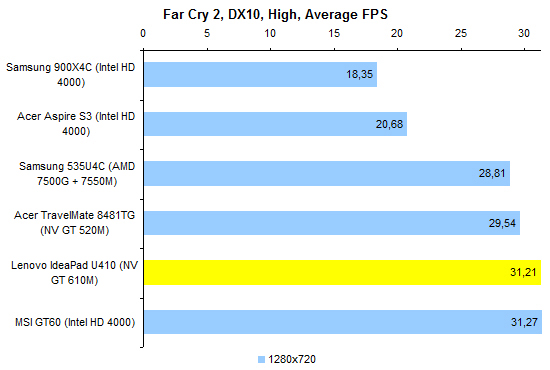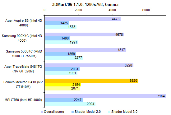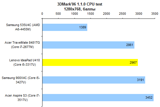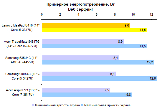 Процессор Copre i5-3317U по производительности примерно соответствует Core i7-2677M — одному из флагманов прошлогодней линейки ULV-процессоров Intel. Подавляющему большинству пользователей производительности этого ЦП будет вполне достаточно. ![]() ![]() Для сравнения результатов графических тестов мы добавили к списку соперников еще один ноутбук, MSI GT60, демонстрирующий, на что способна графика Intel HD 4000 при наличии хорошей системы охлаждения. ![]() ![]() ![]() ![]() Как видите, интегрированное решение Intel поколения Ivy Bridge и NVIDIA GeForce 610M обладают примерно одинаковой производительностью. Так что в данном случае вполне можно было обойтись и без внешнего адаптера — достаточно было обеспечить своевременный отвод тепла от процессора, дабы у того была возможность вводить графическое ядро в режим Turbo Boost. Почему же использовали внешний адаптер? Да просто ради того, чтобы об этом можно было написать в характеристиках. Тем, кто не желает разбираться в тонкостях мобильной графики, строчка в ТХ «внешний видеоадаптер NVIDIA» должна намекнуть на то, что этот ультрабук пригоден для игр. На самом деле он, конечно, не особенно пригоден. Но это покупатель выяснит уже дома. ⇡#Тестирование — масса, время автономной работыВ IdeaPad U410 устанавливают достаточно «упитанный» аккумулятор, основанный на плоских элементах питания. Суммарная емкость сравнительно высока: 59 Вт*ч. Это примерно в полтора раза больше, чем в большинстве других ультрабуков и ультратонких ноутбуков. Комплектный блок питания имеет непривычную вытянутую форму, пожалуй, более удобную при транспортировке — в сумке или чемодане разместить тонкий и длинный предмет, как правило, проще. Мощность адаптера стандартна, 65 Вт, равно как и масса — около 220 грамм без учета силового кабеля. Данная модель — не из тех, что ставят рекорды по части минимальной массы. Собственно, этого и не следовало от нее ожидать. В опубликованных Lenovo характеристиках значится цифра 1,8 килограмма. Но взвешивание показало, что эта цифра немного занижена — в официальных ТХ имеется в виду какая-то гипотетически возможная более легкая конфигурация. На самом деле IdeaPad U410 в том виде, в котором он продается в магазинах, весит 1,88 килограмма. И порядка 2,22 кило вместе с блоком питания и силовым кабелем. Классический (в смысле — не ультрабук) тонкий ноутбук Acer TravelMate 8481TG с дисплеем 14 дюймов и батареей в полтора раза большей емкости весит немного меньше, чем IdeaPad U410. Не говоря уже о новомодных «ультра»: например, участвовавшая в сравнении дисплеев модель ThinkPad X1 Carbon легче на полкило с лишним. ![]() Что касается времени автономной работы, то тут зависит от того, с чем сравнивать. Если иметь в виду сходный уровень цен, то IdeaPad U410 чувствует себя уверенно — прямые конкуренты, Samsung 535U3C и Acer Aspire S3, обладают более скромной емкостью аккумуляторов, так что с ними ультрабук Lenovo расправляется играючи. Но если сравнить с тем же Acer TravelMate или дорогим Samsung 900X3C, то результаты выглядят уже не так хорошо. ![]() ![]() ![]() А все потому, что энергопотребление IdeaPad U410 недостаточно аккуратно оптимизировано. Единственное, что спасает картину в целом, — невысокое энергопотребление дисплея. Тускловатая матрица даже при максимальном уровне яркости не слишком прожорлива. ![]() ![]() ![]() ⇡#ВыводыВ целом IdeaPad U410 не впечатлил. Клавиатура оказалась неудобной, масса — самой высокой среди ультрабуков, не считая разв