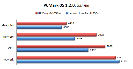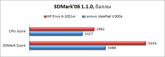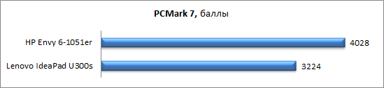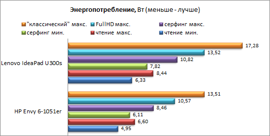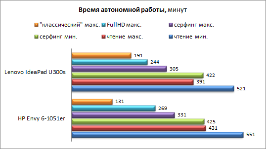 Очередная наглядная демонстрация того факта, что в новом, третьем поколении процессоры Core изрядно прибавили в производительности по сравнению с предыдущим, вторым поколением. Впрочем, в этом мы уже успели убедиться — а вот вопрос с энергопотреблением ноутбуков на новой платформе Intel по-прежнему не закрыт. ⇡#Тестирование: время автономной работыВ ноутбуке используется встроенный в корпус аккумулятор ёмкостью 43 Вт*ч. В корпус 15-дюймового ноутбука могла бы поместиться и достаточно крупная батарея. Немного странно, что в HP ограничились такой небольшой емкостью.  Несмотря на скромный запас энергии, HP Envy 6 работает от аккумулятора достаточно долго. В наиболее востребованных при мобильном использовании режимах он не отстает от Lenovo IdeaPad U300s, емкость батареи которого на четверть больше.  Правда, если сравнить Envy 6 с другим 15-дюймовым ультрабуком, Acer Aspire M3, то результаты несколько блекнут: последний способен проработать на час-другой дольше. ⇡#ВыводПятнадцатидюймовый ультрабук HP получился красивым, тонким и достаточно лёгким. Жесткость корпуса довольно высока, однако материалы оказались весьма маркими — темные металлические панели с невероятной скоростью собирают отпечатки пальцев и притягивают пыль. Клавиатура хороша, к ней есть лишь несколько мелких замечаний. Огромная сенсорная панель также весьма удобна в работе. Дисплей по качеству изображения несильно превосходит те, что используются в бюджетных моделях обычных ноутбуков. А звук, на который возлагались большие надежды, этих надежд не оправдал: по крайней мере в протестированном экземпляре уровень шума на аналоговом выходе был довольно высок, а в процессе проигрывания периодически проявлялся кратковременный треск. Производительность ноутбука довольно высока, при этом по длительности автономной работы HP Envy 6 не уступает 13-дюймовым ультрабукам, за что нужно благодарить матрицу с низким энергопотреблением. Греется ультрабук несильно, но и шумит негромко — при невысоких и средних нагрузках Envy 6 практически бесшумен. Что касается цены, то ее сложно назвать низкой: за уменьшенные габариты и массу придется доплатить. Впрочем, назвать эту доплату чрезмерно большой тоже не получится. Редакция 3DNews благодарит компанию «Графитек» за предоставленный в распоряжение нашей лаборатории измерительный комплекс Spyder4Elite и украинское представительство HP за предоставленный ультрабук HP Envy 6.