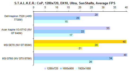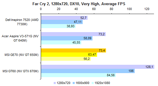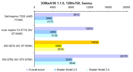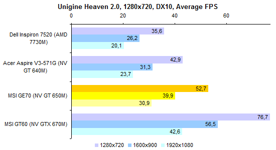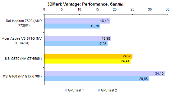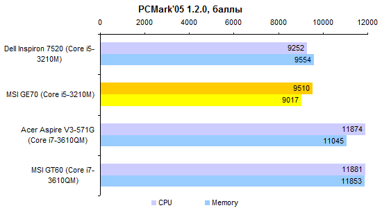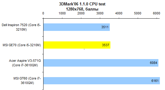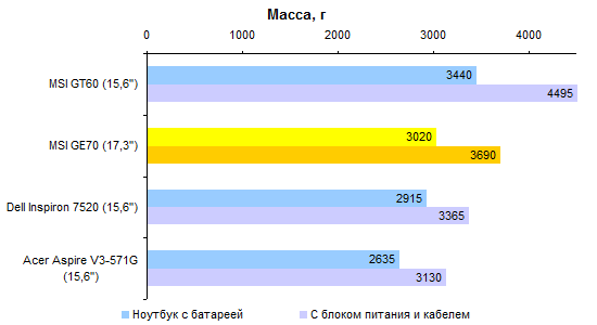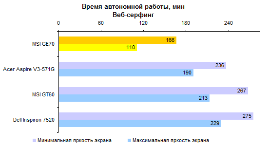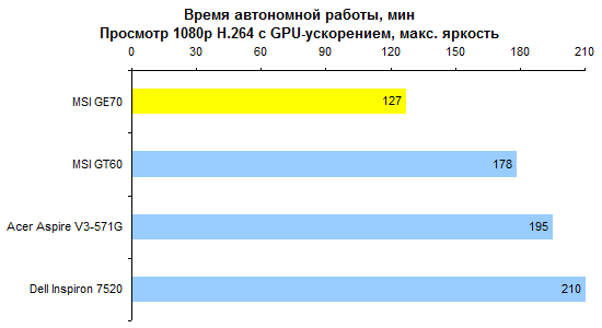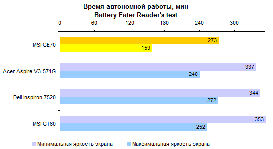В чисто процессорных тестах двухъядерный Core i5-3210M ожидаемо проигрывает четырехъядерному Core i7-3610QM. ![]() ![]() Что касается графики, то результаты вполне соответствуют позиционированию NVIDIA. Адаптер GeForce GT 650M, разумеется, быстрее, чем GT640M, разогнанную версию которого он собой и представляет. Но до GTX 670M ему далеко. Что опять-таки логично, между 650M и 670M в линейке NVIDIA помещается еще один адаптер, GeForce GTX 660M — наиболее быстрое решение на чипе GK107, на котором основаны 640M и 650M. ![]() ![]() ![]() ![]() ![]() ![]() Чудес производительности в играх от GeForce GT 650M в целом и MSI GE70 в частности ожидать не стоит. Это хороший адаптер, но настоящие игровые решения прописаны парой этажей выше. Если есть желание получить действительно серьезную скорость, то стоит готовить заметно больше денег и посматривать в сторону MSI GT60/GT70 и подобных ноутбуков. ⇡#Тестирование — масса, время автономной работыВ отличие от ноутбуков MSI GT, в которых используются большие 9-элементные аккумуляторы, в менее производительные модели серии GE устанавливают стандартные батареи из 6 цилиндрических элементов питания. Емкость невысока: около 49 Вт*ч, то есть на уровне бюджетных ноутбуков. Блок питания также в полтора раза скромнее по характеристикам: вместо монструозного 180-ваттника, которым укомплектован GT60, к MSI GE70 прилагается 120-ваттный адаптер. Тоже не пушинка (545 грамм), но все-таки компактнее. Весит ноутбук немного: «тушка» вместе с аккумулятором тянет на три килограмма с небольшим. Если добавить блок питания и кабель, получится 3,7 кило — для 17-дюймового ноутбука с начинкой такого уровня это вполне неплохо, некоторые «пятнашки» будут даже тяжелее. ![]() Качественный дисплей MSI GE70 потребляет весьма немало энергии, а малоемкий аккумулятор не способен компенсировать это потребление. В итоге от одного заряда батареи ноутбук работает недолго: даже при минимальной нагрузке на процессор можно ожидать не более 4,5 часов работы. И это на минимальной яркости: если поднять уровень подсветки до максимума, то батарея опустеет за 2,5 часа. ![]() Если же хотя бы немного загрузить работой процессор и Wi-Fi-адаптер, то результаты окажутся и вовсе плачевными: в режиме беспроводного серфинга MSI GE70 продержится от 110 до 166 минут в зависимости от уровня подсветки. ![]() Просмотр Full HD может продолжаться порядка двух часов. Большинство нынешних фильмов немного длиннее, так что посмотреть современный блокбастер без розетки, скорее всего, не получится. ![]() Впрочем, для настольного ноутбука столь низкое время автономной работы не является критичным. Аккумулятор в данном случае следует воспринимать как источник бесперебойного питания. И в этом смысле он вполне хорош: 2-3 часа работы при отключении электричества он всегда обеспечит. ⇡#ВыводыВ MSI по-прежнему относятся к проектированию корпусов как к неприятной обязанности по обрамлению электронной начинки. С разработкой компьютера у конструкторов MSI проблем нет, а вот внешность и эргономика ноутбука даются дизайнерам не очень хорошо. С другой стороны, когда речь идет о настольной модели, такой подход допустим. Среди плюсов MSI GE70 — пожалуй, оптимальная для домашнего ноутбука конфигурация и невысокая цена: в любом поиске по товарам эта модель стабильно занимает первую строчку по запросу «17.3 650M». В качестве бонуса — чрезвычайно хороший во всех отношениях дисплей. У ближайших конкурентов каче