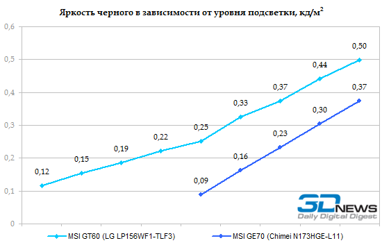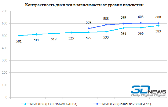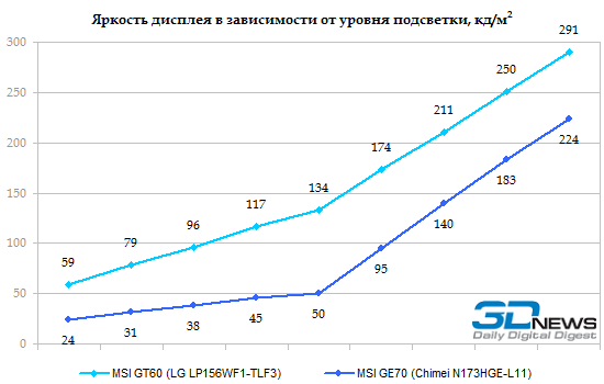 Базовый процессор для GE70 — двухъядерный Core i5-3210M. Он далеко не топовый, но его характеристики таковы, что жалеть о нехватке вычислительной мощности придется немногим. Номинальная частота составляет 2,5 ГГц, в режиме Turbo Boost процессор умеет разгоняться до 3,1 ГГц. В ноутбуках MSI GT для установки памяти доступны четыре разъема расширения. В GE70 их вдвое меньше — в нашем случае занят был только один из разъемов, в нем был установлен модель DDR3-1600 объемом 4 Гбайт. Система автоматического переключения графики NVIDIA Optimus в настоящее время используется в подавляющем большинстве ноутбуков, оборудованных адаптерами GeForce. Не стала исключением и модель MSI GE70. В качестве производительного компонента двойной графической системы задействован адаптер NVIDIA GeForce GT 650M. Это одна из тех моделей графики NVIDIA, которые допускают заметные вариации характеристик. Например, ГП может быть укомплектован медленной памятью DDR3 или быстрой GDDR5 — на внешнем маркетинговом названии это никак не отражается, так что при покупке нельзя быть уверенным, какой вариант вам достанется. В MSI специально подчеркивают, что играть с покупателем в подобные игры они не намерены, и будут использовать именно правильные версии таких «варьирующихся» видеоадаптеров, с оптимальным сочетанием характеристик. В данном случае это означает наличие GDDR5, работающей на частоте 4х1000 МГц. Как и в других игровых ноутбуках MSI, в модели GE70 все заменяемые компоненты размещены в одном большом отсеке на днище ноутбука. Таким образом, пользователь имеет возможность добраться до жесткого диска, обоих разъемов расширения памяти и платы беспроводной сети Mini Card. Более интересно другое: в GE70 есть свободный разъем для установки SSD, выполненного в форм-факторе mSATA (на фото — прямо над процессором). Так что ноутбук идеально подходит для организации гибридной дисковой системы: быстрый твердотельный накопитель для ОС и приложений, емкий винчестер для данных. Заканчивая обсуждение конфигурации ноутбука, имеет смысл упомянуть еще об одной особенности MSI GE70: этот ноутбук можно приобрести без предустановленной операционной системы. ⇡#Тестирование — дисплейВсе похвалы, которые автор этой статьи расточал в обзоре MSI GT60, уместны и в данном случае. В GT60 использовался экран LG LP156WF1-TLF3, и это было очень хорошо. А в GE70 (судя по всему, в GT70 ставят то же самое) мы встретились с ЖК-матрицей Chimei Innolux N173HGE-L11. И это, как ни удивительно, даже немного лучше. Компания Chimei серьезно выросла в наших глазах после обзора ASUS UX21E — единственного в мире 11-дюймового ультрабука с IPS-дисплеем, матрица в нем оказалась как раз производства Chimei. Так что в этот раз мы уже не удивлялись хорошим результатам. Очевидные плюсы дисплея MSI GE70: матовое покрытие и высокое разрешение — 1920x1080 Матрица в «семнашках» MSI заметно менее яркая, чем в «пятнашках». Это некритично — яркость выше 200 кд/м2 в закрытом помещении не требуется, а к работе на свежем воздухе крупный ноутбук не располагает. Его место на столе, и тут будет вполне достаточно тех 224 кд/м2, которые выдает его экран. ![]() Алгоритм изменения уровня подсветки заметно отличается: в нижней части диапазона яркость изменяется медленно, а во второй половине — стремительно растет. По этой причине значения светимости черного поля нам удалось получить только для половины ступеней регулировки — на остальных чувствительнос