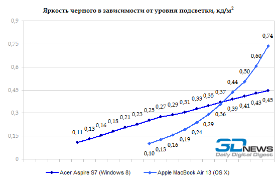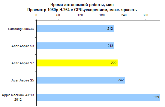Толщина корпуса более-менее постоянна, в центральной части без учета ножек она составляет 8 мм. Толщина крышки чуть варьируется из-за того, что внутреннее стекло на дисплее в предсерийном образце наклеено несколько неаккуратно — от 4,7 до 5 мм. Это стекло на доли миллиметра выступает над металлической рамкой, и этот выступ уходит в выемку на корпусе. Поэтому простое сложение тут не работает: толщина с учетом крышки составляет 12,3 мм, меньше суммы корпуса и крышки по отдельности. Если посчитать вместе с задними ножками, то получится 14 миллиметров ровно. С передними, менее толстыми и расположенными на скосе корпуса — на полмиллиметра меньше. Какую из этих цифр считать «той самой толщиной», читатель может выбрать самостоятельно. В штатных ситуациях производители обычно указывают ту, что без ножек: в данном случае это 12,3 мм. Но если особенно припрет и любой ценой понадобится стать тоньше всех на свете — могут заявить и 8 мм одного только корпуса, и такое бывало. В отличие от большинства ультратонких ноутбуков, Aspire S7 умеет раскладываться на развернутый угол — и даже чуть-чуть шире Клавиатура — пожалуй, самый неоднозначный элемент Acer Aspire S7. Как несложно заметить, в Acer радикально переработали клавиатурный блок: из него исчез целый ряд. В финальных ноутбуках должна быть подсветка клавиатуры, но в нашем случае она то ли не работала, то ли ее не было вовсе И если функциональные клавиши можно сравнительно безболезненно сместить на сочетания Fn с цифровыми кнопками, то более востребованные — вроде Escape или Delete — пришлось налепить как бы вторым слоем. Поначалу такое смелое решение, само собой, вызывает негодование. Однако в работе раскладка оказывается не настолько ужасной, как того можно было ожидать. По крайней мере, клавиатурный блок значительно шире, чем в Aspire S3/S5, так что основные клавиши получились достаточно крупными. Как и во всех других сверхтонких моделях, клавиши имеют короткий ход. С точки зрения механики, клавиатура получилась более удачной, чем в Aspire S3 и Aspire S5, — ощущения при нажатии немного приятнее. Подложка клавиатуры жесткая и прекрасно закреплена, нельзя пожаловаться и на крепление шапок клавиш на механизме. В общем, по части тактильных ощущений клавиатура хороша настолько, насколько вообще могут быть хороши короткоходные модификации. Из-за сдвинутой в сторону пользователя клавиатуры немного пострадала сенсорная панель. Малую ее высоту конструкторы компенсировали увеличенной шириной — панель получилась широкоформатной и по размерам (105x59 мм) весьма напоминает панель MacBook Air 11 (104x63 мм). По качеству покрытия эти тачпады тоже весьма близки. Кнопки, в соответствии с модной тенденцией, виртуальные. Панель при этом — производства компании ELAN. Следовательно, распознавание кликов работает, мягко говоря, не очень стабильно. В данном случае (вероятно, особенность тестового экземпляра) в драйверах тачпада не была задействована поддержка мультисенсорных жестов, так что клики распознавались чуть более уверенно, чем обычно. Как и в предыдущих ультрабуках Acer, индикаторы зарядки и питания в Aspire S7 расположены в выступе корпуса и хорошо видны как при открытой, так и при закрытой крышке Вся задняя сторона корпуса выделена под входные и выходные отверстия системы охлаждения. Единственный полезный элемент на передней стороне — микрофон (на