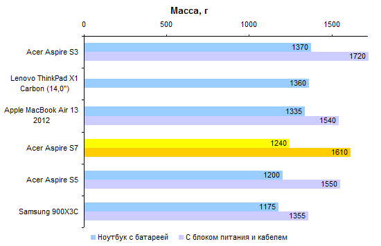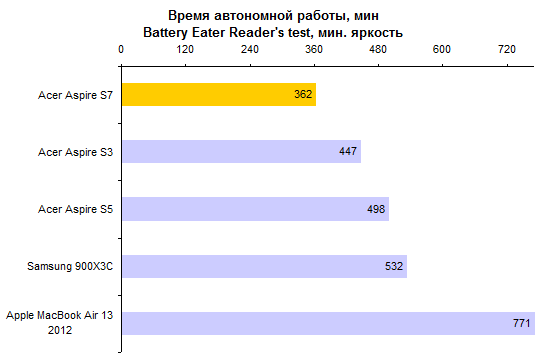 Судить о конфигурациях серийных ультрабуков по раннему семплу не имеет особого смысла. Скажем, в нашем случае был установлен процессор Core i5-3317U. Однако Aspire S7 на российском рынке будут продавать дорого — поэтому процессоры, скорее всего, будут более продвинутые. Предсказываем появление Core i7-3517U. ![]() ![]() Южный мост, скорее всего, будет таким же, что и в протестированном семпле, — Intel HM77. Хотя теоретически его могут поменять на более энергоэффективное и компактное решение, Intel UM77 или QS77. ![]() В нашем экземпляре Aspire S7 на материнской плате была распаяна память DDR3-1333 объемом 4 Гбайт. Вероятно, в розничных ноутбуках будет все же DDR3-1600. Объем потенциально может быть вдвое больше — места на материнской плате для этого хватит. А вот разъемов расширения не предусмотрено, так что самостоятельно нарастить оперативку точно не выйдет. ![]() Как и все остальные ультратонкие ноутбуки, Acer Aspire S7 будут оснащать только интегрированной графикой Intel HD 4000. ![]() Говорить о точных ценах пока преждевременно: на прилавки магазинов Aspire S7 попадет еще нескоро, к тому моменту все может сильно измениться. Однако дешевым он совершенно точно не будет: на данный момент в российском представительстве Acer рассчитывают на сегмент $1 500+. ⇡#Внутреннее устройствоВ Aspire S3 и Aspire S5 конструкторы Acer проявили изрядную силу воли: не повелись на модные тенденции и вместо красивенького точеного алюминия, дорогого в производстве, использовали менее накладный и более удачный с точки зрения практических свойств материал — магниевый сплав. Жаль, но наш мир сейчас устроен так, что в подобных вопросах Силы Разума неизбежно проигрывают Силам Добра. Крашеный магниевый сплав внешне смахивает на пластик и радует глаз несравненно меньше, чем нарядный анодированный люминь. Поэтому среднестатистический хомячок покупатель предпочитает последний. Так что пришлось конструкторам пойти на уступку. Впрочем, совсем уж сдаваться они не собираются: в Aspire S7 скомбинированы оба этих материала. И это, видимо, оптимальное решение с учетом всех обстоятельств. Нижняя половинка корпуса, которую все равно почти никто и никогда не видит, сделана из магниевого сплава и покрашена качественной белой краской, стойкой к царапинам и не маркой. По иронии судьбы даже сотрудники Acer считают эту деталь Aspire S7 пластиковой. Внутри нашлась царапинка, по которой легко определить, что деталь металлическая. Даже если не признать характерную неприглядность анодированного магниевого сплава Верх корпуса и рама крышки выточены из алюминия, что сразу добавило +5 к харизме ультрабука. Комбинацию можно считать очень удачной еще и в том отношении, что корпус получился действительно жестким, несмотря на толщину в 8 миллиметров. На всякий случай еще раз напомним, что мы имели дело с предсерийным образцом Aspire S7. В отдельных моментах финальные ноутбуки могут быть устроены иначе. Однако общая компоновка должна остаться неизменной. Скажем, двойная система охлаждения, с одним вентилятором, работающим на вдув, а другим на выдув, должна сохраниться. Собственно, эти самые вентиляторы и являются той причиной, по которой от клавиатуры отрезали один ряд, — попытка поставить эти элементы друг над другом в 8-миллиметровом корпусе, очевидно, не увенчалась успехом. Самый удивительный компонент Aspire S7 — это аккумулятор. Пожалуй, это самая тонкая батарея но