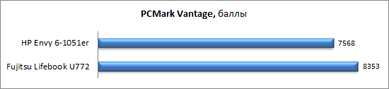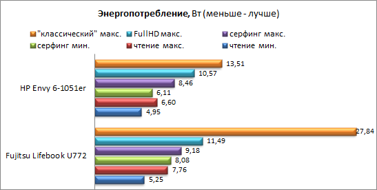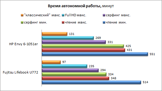 ⇡#Тестирование: время автономной работыВ Fujitsu Lifebook U772 использован встроенный в корпус аккумулятор, состоящий из четырех плоских элементов питания. Суммарная емкость составляет около 45 Вт*ч (3150 мА*ч, 14,4 В), что является типичным значением для ультрабуков с диагональю дисплея 13-14 дюймов. ![]() ![]() При низких нагрузках ультрабук Fujitsu живет достаточно долго — рассчитывать можно где-то на пять часов нормальной работы, но серьезные нагрузки разряжают батарею просто-таки с рекордной скоростью. HP Envy и в целом способен продержаться дольше, и не настолько зависим от уровня нагрузки процессора.