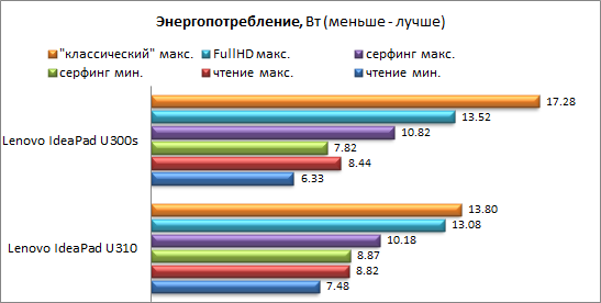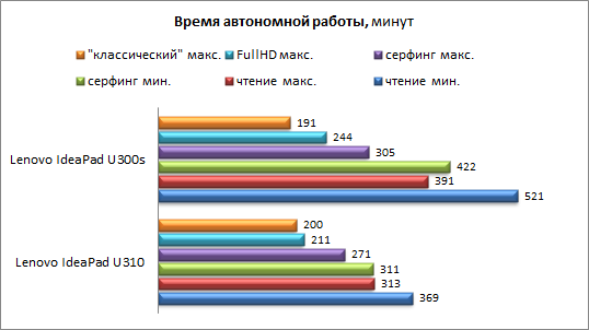 ⇡#Тестирование: время автономной работыВ IdeaPad U310 использован более скромный аккумулятор, нежели в IdeaPad U300s. Емкость батареи в новом ноутбуке составляет 46 Вт*ч против 54 Вт*ч в более дорогом U300s. Разумеется, это сказалось на результатах тестирования автономной работы: прошлогодняя модель работает заметно дольше. ![]() ![]() ⇡#ВыводТолщина корпуса лишь на пару миллиметров больше, чем у наиболее тонких представителей класса, что вроде бы не страшно. А вот масса 1,7 кг для 13,3-дюймового ультрабука — это уже немало, ведь существуют даже модели весом 875 грамм (правда, стоит этот ультрабук — NEC LaVie Z — более $1 600 за базовую модификацию). В отличие от прошлогоднего IdeaPad U300s, новый ультрабук Lenovo получил впечатляющий набор разъемов. Однако попутно конструкцию удешевили: масса выросла, но жёсткость корпуса стала ниже. Что касается дисплея, то тут всё просто — он очень дешёвый, поэтому ожидать от него хорошей картинки не стоит ни в коем случае. Зато качество звучания встроенных динамиков весьма неплохое. Правда, расположены они не вполне удачно, при изменении угла наклона крышки существенно изменяется качество звука. Уровень генерируемого охлаждающей системой шума невысок, а алгоритм работы активной составляющей может служить эталоном для большинства ультрабуков. По сравнению с моделью U300s заметно снизился уровень нагрева корпуса, но всё же он чуть выше, чем у конкурентов. Во многом недостатки оправдывает цена: Lenovo IdeaPad U310 — один из самых доступных ноутбуков, в конфигурации с Core i3 и вспомогательным SSD он стоит всего 22 тысячи рублей. Хотите идеала? Не вопрос, у Lenovo и такое есть. Но придется доплатить еще столько же — или даже больше. Редакция 3DNews благодарит компанию «Графитек» за предоставленный в распоряжение нашей лаборатории измерительный комплекс Spyder4Elite и украинское представительство Lenovo за предоставленный ультрабук Lenovo IdeaPad U310.