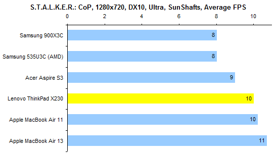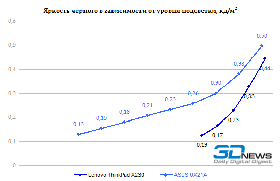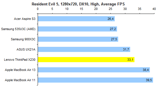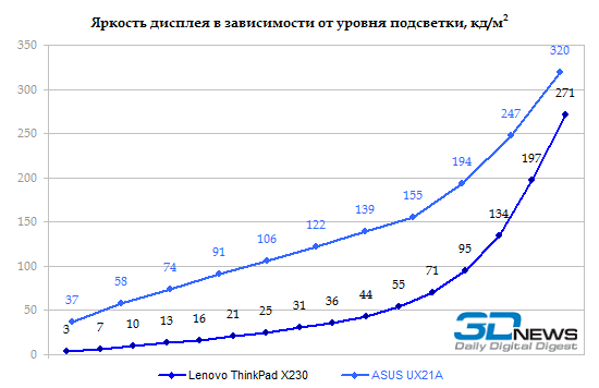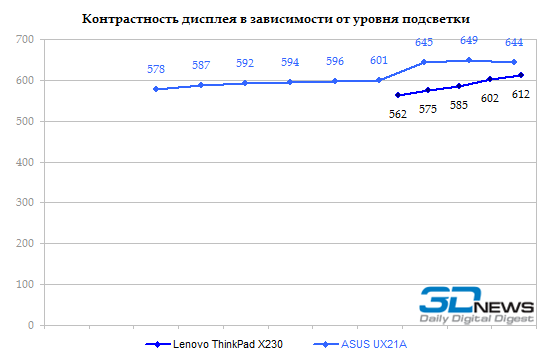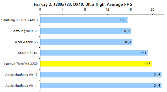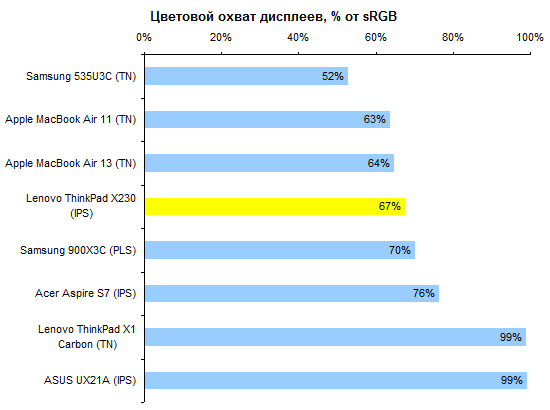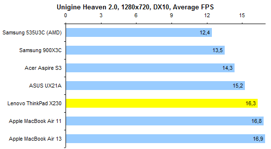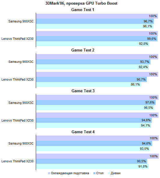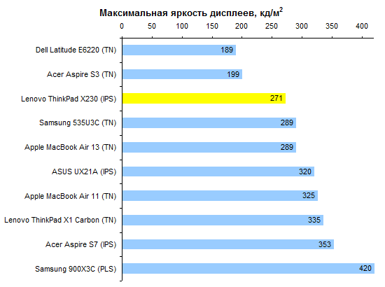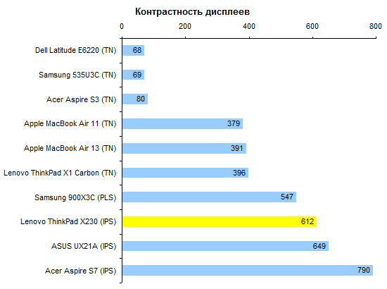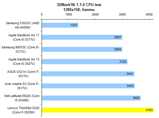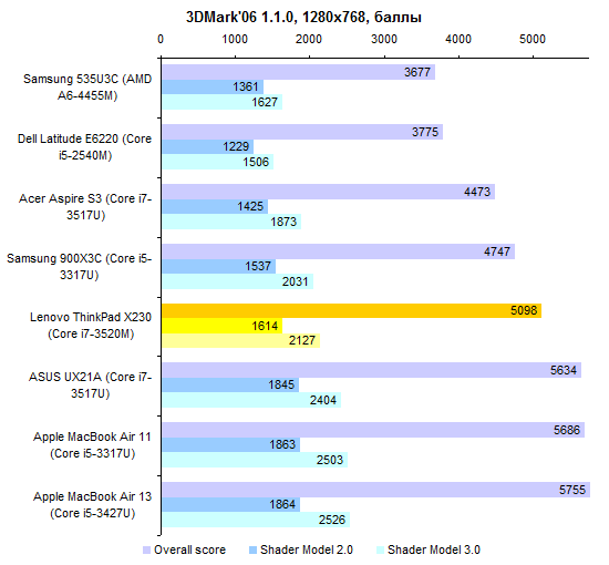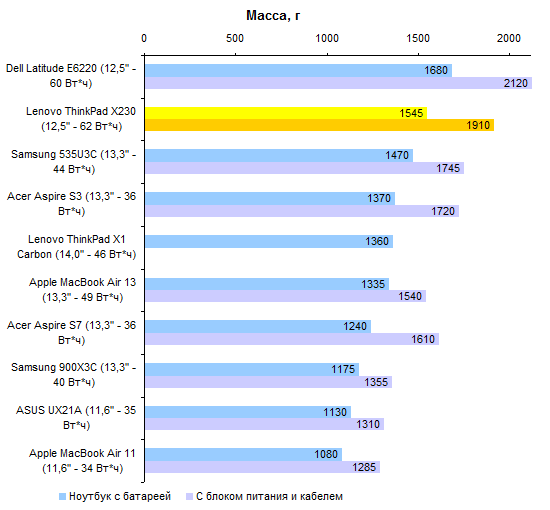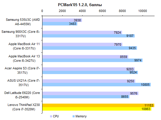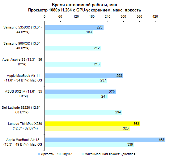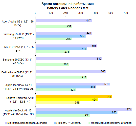 С одной стороны, по части процессорной производительности ThinkPad X230, вероятно, нет равных среди настолько компактных ноутбуков. С другой стороны, низковольтные процессоры Intel в новом поколении изрядно «подросли», так что многим пользователям вполне может хватить и их прыти — не факт, что стоит гнаться за топовым Core i7. ![]() ![]() Во всех сравниваемых ноутбуках — за исключением Dell на прошлогоднем процессоре и Samsung на AMD — используется один и тот же графический адаптер Intel HD 4000, обладающий одной и той же (с некоторыми отклонениями) частотой турборежима. Поэтому тест графики в данном случае — это на самом деле не тест «кремния», а тест системы охлаждения. Ведь весь вопрос в том, насколько долго она позволит процессору удерживать максимальную частоту графического ядра. ![]() Несмотря на более просторный корпус ThinkPad X230, потенциал системы охлаждения оказался примерно таким же, как и в ультрабуках, — она не позволяет графическому ядру разгоняться на полную катушку. ![]() ![]() ![]() ![]() Особенно хорошо видна недостаточная производительность системы охлаждения при изменении условий работы. По сравнению с показателями в идеальной ситуации (использование ноутбука в сочетании с подставкой-кулером), производительность в графических тестах существенно понижается, если ноутбук просто стоит на столе или — тем более — на мягкой поверхности. ![]() ⇡# Тестирование — масса, время автономной работыВообще, для ThinkPad X230 существует целых три варианта штатных аккумуляторов: тонкий (4 элемента, 29 Вт*ч), стандартный (6 элементов, 62 Вт*ч) и расширенный (9 элементов, 94 Вт*ч). Кроме того, как уже было сказано выше, под днище можно установить дополнительную плоскую батарею еще на 64 Вт*ч. Мы имели дело лишь с одним аккумулятором, построенным на 6 цилиндрических элементах питания, — точь-в-точь такая же батарея была использована в школьном ноутбуке ThinkPad X131e. Комплектный блок питания также стандартен для ThinkPad — это средних размеров адаптер мощностью 65 Вт. По сравнению с ультрабуками Lenovo ThinkPad X230 получился, конечно же, неприлично тяжелым. С другой стороны, в нем есть многое, чего нет ни в одном из ультратонких ноутбуков, а цена вопроса — лишняя пара сотен граммов, можно и потерпеть. ![]() Ноутбук достаточно долго работает от штатного аккумулятора — плюс не стоит забывать про возможность наращивания ёмкости несколькими способами. Ультрабуки на Windows ему в этом отношении не конкуренты. А вот более эффективная по части энергопотребления Mac OS позволяет 13-дюймовому MacBook Air обойти ThinkPad, даже несмотря на меньшую емкость аккумулятора. ![]() ![]() ⇡# ВыводыКатегорически рекомендуем этот ноутбук всем приверженцам классических форм-факторов, не приемлющим слишком тонкие современные решения. Лучшего компактного ноутбука традиционного стиля, вероятно, на рынке не найти. Впрочем, высокая производительность, достаточно удачный дисплей и прекрасная клавиатура могут соблазнить даже тех, кто уже нацелился на покупку ультрабука. Да и в целом ThinkPad X230, даже несмотря на ограничения, накладываемые размерами, оказался удивительно удобным и приятным в мелочах и деталях. Скажем, автор этой статьи уже почти готов продать душу поменять свой тонкий ноутбук на брутальный, но чрезвычайно уютный ThinkPad X230. Единственное, что не дает ему покоя: ведь одно другому не мешает, в природе есть ультратонкий ThinkPad X1 Carbon. Кстати, ско