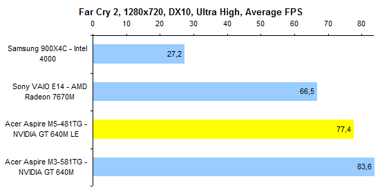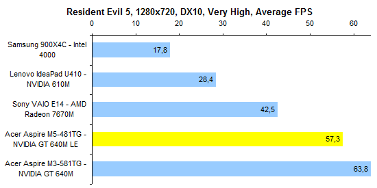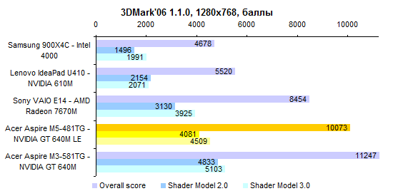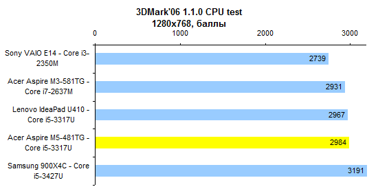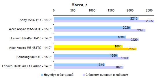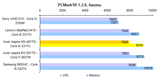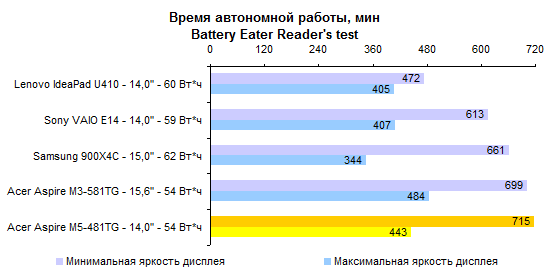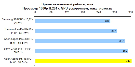 Процессор Core i5-3317U — один из наших фаворитов по сочетанию производительности, энергопотребления и цены. Конечно, есть столь же холодные, но более быстрые Core i7, — однако обходятся они ощутимо дороже. ![]() ![]() Производительность графической системы достаточно высока — по крайней мере для компактного ноутбука весом менее двух килограмм. Бывает и еще выше, зато в данном случае обошлось без сопутствующих недостатков. ![]() ![]() ![]() ![]() ![]() ⇡# Тестирование — время работы от аккумулятораВ серии Acer Aspire M5 используется точно такой же аккумулятор, как в протестированном нами весной Aspire M3. Это несъемная батарея, состоящая из плоских элементов питания суммарной емкостью около 54 Вт*ч. В большинстве случаев ноутбуки с дискретным видеоадаптером комплектуют крупным и тяжелым 90-ваттным блоком питания. В данном случае это, к счастью, не так: к Aspire M5-481TG прилагается сравнительно компактный адаптер мощностью 65 Вт. Масса самого ноутбука с учетом оптического привода и аккумулятора составляет ровно 1800 грамм. Блок питания и сетевой кабель добавляют к этому значению еще 360 грамм. В итоге масса комплекта превышает 2 килограмма. Но чрезмерной ее не назовешь — классические мультимедийные ноутбуки с дисплеем 14 дюймов, такие как Sony VAIO E14, весят на полкило больше. Ультрабуки бывают и легче, но не с оптическим приводом и не с полноценным видеоадаптером. ![]() У Acer в последнее время здорово получается минимизировать энергопотребление. В отличие от многих других ультрабуков, Aspire M5-481TG может обеспечить до 6-7 часов реальной автономной работы. А в режиме работы с минимальной нагрузкой он способен протянуть почти 12 часов. ![]() ![]() ⇡# ВыводыОжидать от данной модели «турболакшери» не стоит. Несмотря на некоторые попытки повысить его престижность (металлическая отделка корпуса, подсветка клавиатуры) — это достаточно бюджетное решение. Тем, кто ждет высокого уровня исполнения, внимания к деталям и тому подобного, Aspire M5 никак не подойдет. Однако это хороший вариант для других людей. Для тех, кто хочет за достаточно небольшие деньги получить максимум начинки. Смотрите: масса — небольшая; годный видеоадаптер — в наличии; время работы от батареи — лучшее в классе; удобная клавиатура — имеется, даже с подсветкой. Опять же полноценный SSD и отличный процессор. Неплохо за $1 000. Редакция 3DNews благодарит компанию «Графитек» за предоставленный в распоряжение нашей лаборатории измерительный комплекс Spyder4Elite .