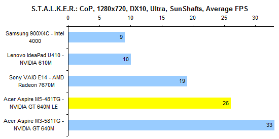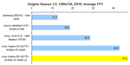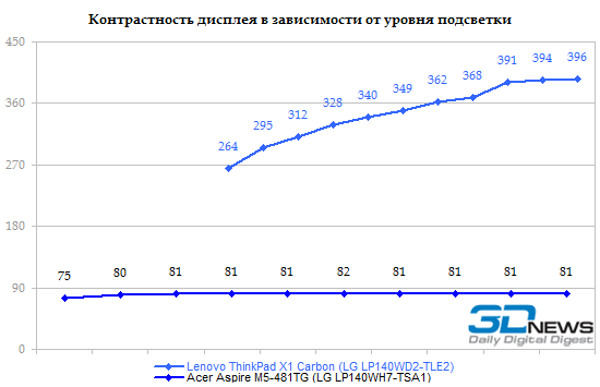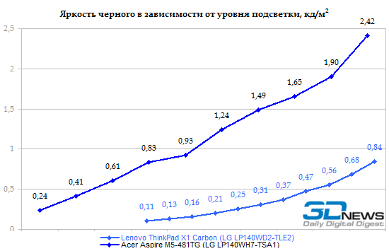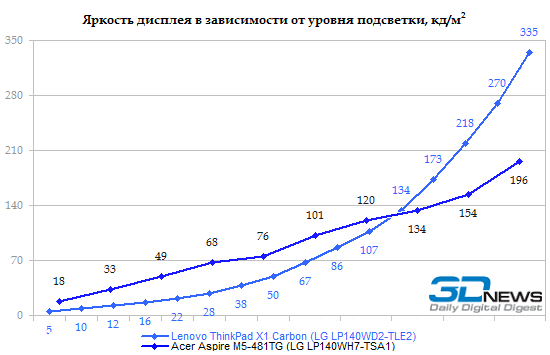 Мы протестировали 14-дюймовый Acer Aspire M5 именно в той конфигурации, которая продается на российском рынке: M5-481TG, с процессором Core i5-3317U. Это, пожалуй, самый правильный процессор в низковольтной серии Intel — и не слишком медленный, и не особенно дорогой. ![]() ![]() Часть памяти (2 Гбайт) в Aspire M5 распаяна на материнской плате. Но есть и разъем расширения SO-DIMM, в нашем случае он был занят модулем DDR3-1333 (обычной DDR3, не DDR3L) объемом 2 Гбайт. Итого — 4 Гбайт с возможностью увеличения. ![]() Графическая система двойная: встроенный в процессор Intel HD 4000 плюс NVIDIA GeForce GT 640M LE, с автоматическим переключением NVIDIA Optimus. По внешним признакам графика точно такая же, как в недавно протестированном ноутбуке Sony VAIO S15. Но есть нюанс, который остается за рамками официального маркетинга: если в Sony использовали память DDR3, работающую на эффективной частоте 2x900 МГц, то в Acer предпочли более быструю GDDR5 с частотой 4х1000 МГц. ![]() Возможность удобного доступа к заменяемым компонентам в Aspire M5-481TG не предусмотрена. Чтобы добраться до разъема памяти, накопителя или батареи, придется разобрать ноутбук. Несущей деталью в данном случае является днище: оно изготовлено стеклопластика (поликарбонат + стекловолокно), благодаря чему обладает вполне солидной жесткостью. Поэтому вся электроника крепится именно на эту деталь. Верхняя половинка корпуса — та, в которую встроены клавиатура и тачпад, — представляет собой «бутерброд»: в основе хлипкий пластик ABS+PC, с внешней стороны он декорирован тонким слоем металла. В Acer Aspire M5 предусмотрена возможность установки как стандартного жесткого диска, выполненного в форм-факторе 2,5 дюйма, так и твердотельного накопителя формата mSATA. Правда, в данной конфигурации установлен только миниатюрный SSD, поэтому шлейфа для обычного винчестера в комплекте нет. ⇡# Тестирование — дисплейВ Acer Aspire M5-481TG использована достаточно интересная ЖК-матрица LG LP140WH7-TSA1. Данная матрица предназначена для ноутбуков со сверхтонкой рамкой (таких, например, как Acer TravelMate 8481TG). В единую сборку, помимо непосредственно дисплея, интегрирована рамка и расположенная в ее верхней части веб-камера. Что интересно, конструкторы совершенно не воспользовались теми возможностями, которые предоставляет данная модель дисплея — поля вокруг экрана весьма широкие. А жаль, ведь необычная конструкция, позволяющая делать очень компактные ноутбуки, — единственное, чем может похвастаться данная модель дисплея. В остальном — сплошные минусы. Начать следует с того, что матрица имеет глянцевое покрытие. Алгоритм изменения уровня яркости удивительно неаккуратный. Обычно в ноутбуках Acer график ступенек подсветки представляет собой прямую линию, а в данном случае получилась какая-то странная загогулина. Максимальная светимость белого не особенно высока: около 200 кд/м2. ![]() А вот светимость черного, напротив, хотелось бы уменьшить в несколько раз — при максимальном уровне подсветки она доходит почти до 2,5 кд/м2. ![]() Итоговая контрастность — 81:1 — смотрится жутко даже на фоне добротной TN-матрицы, использованной в ультрабуке Lenovo ThinkPad X1 Carbon. А уж по сравнению с IPS-дисплеями это просто слезы. ![]() Цветовой охват крайне узок — 60% от пространства sRGB. Гамма-кривые (черные линии на графике) имеют мало общего с эталонными (цветные линии). Точность передачи оттенков хромает на обе ноги. В целом дисплей чрезвычайно неказисты