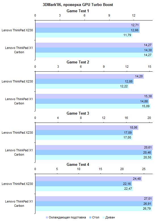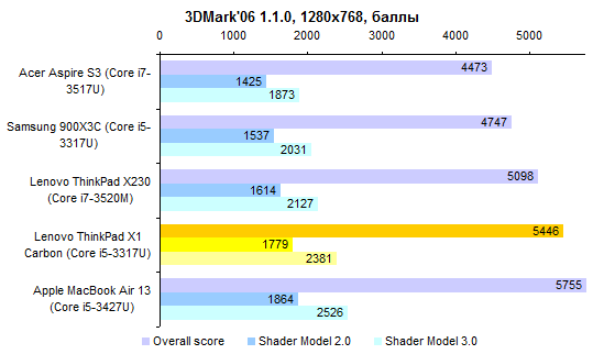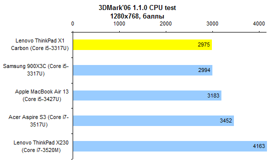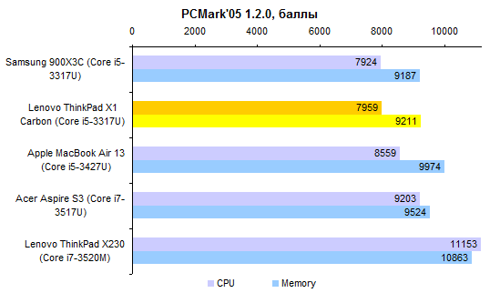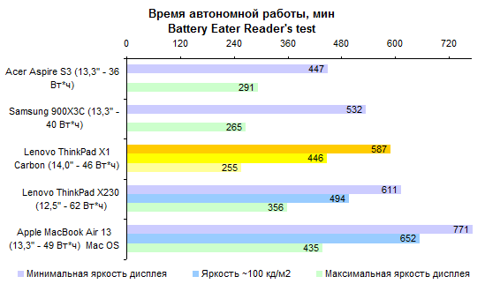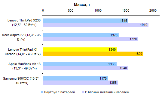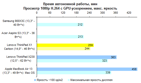 По части процессорной производительности протестированная конфигурация не слишком примечательна — особенно на фоне ThinkPad X230, который оснащают полноценными, а не низковольтными мобильными процессорами. И все же Core i5-3317U — это далеко не Atom, для большинства повседневных задач его производительности хватает с головой. ![]() ![]() По большому счету, нет ничего выдающегося и в графической системе — адаптеры, которые Intel интегрирует в мобильные процессоры, практически не отличаются. ![]() В общем-то, единственное, что позволяет одному ультрамобильному ноутбуку обогнать другой в графических тестах, — это способность дольше поддерживать графическое ядро в разогнанном состоянии. А зависит данная способность от системы охлаждения. Как ни странно, в этом отношении ультрабук ThinkPad X1 Carbon оказался даже лучше, чем «толстячок» ThinkPad X230. ![]() ⇡#Тестирование — масса, время автономной работыАккумулятор совершенно не изменился по сравнению с тем, который мы видели в предсерийной версии ThinkPad X1 Carbon. Он построен на плоских элементах питания, а его емкость составляет около 46 Вт*ч. Вообще говоря, корпус мог бы вместить и более емкую батарею, но тогда пришлось бы обойтись клавиатурой с более коротким ходом клавиш. Протестированный нами демонстрационный семпл оснащался компактным блоком питания мощностью 65 Вт. Однако к серийному ThinkPad X1 Carbon почему-то прилагается излишне мощный и довольно увесистый 90-ваттный адаптер. Сам по себе ультрабук получился весьма легким: при ощутимо большей диагонали дисплея он весит столько же, сколько MacBook Air 13. Однако блок питания все портит — вместе с кабелем он добавляет к массе без малого полкило. Это достаточно распространенная ситуация: конструкторы всеми силами создают рекордно легкое и от этого весьма недешевое устройство, а потом кто-то принимает решение укомплектовать ноутбук большим и тяжелым блоком питания, уничтожающим весь эффект от приложенных конструкторами усилий и потраченных покупателем денег. ![]() Что касается времени работы от аккумулятора, то с ним дела обстоят примерно так же, как и у других ультрабуков из высокой ценовой категории. Качественный, прожорливый дисплей контрастирует с недостаточно емким аккумулятором. ![]() В итоге при минимальном уровне подсветки и минимальной же нагрузке на систему время автономной работы вполне приличное. Но стоит увеличить яркость экрана или нагрузить процессор чем-нибудь даже не слишком сложным — и батарея пустеет за считаные часы. ![]() Ноутбуки классической конструкции в этом отношении все еще предпочтительнее: даже штатные аккумуляторы таких моделей, как ThinkPad X230, обеспечивают большую емкость. А ведь батарею можно заменить более емкой или дополнить вторым аккумулятором — ультрабуки такого не позволяют. ⇡#ВыводыМодель X1 Carbon выглядит несколько менее брутально, чем классические ThinkPad, и обладает меньшим набором корпоративных функций. Скажем, к ней нельзя подключить док-станцию или аккумулятор повышенной емкости. И с подключением проектора вероятны проблемы — VGA здесь нет. Так что для воинов PowerPoint и Outlook, вероятно, Lenovo ThinkPad X230 будет по-прежнему более интересным. А ThinkPad X1 Carbon — все-таки более легкомысленная модель. Подойдет она тем, кому от ноутбука нужны только хороший дисплей и шикарная клавиатура — а все остальное предпочтительно выбросить ради минимальной массы. И в