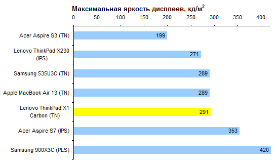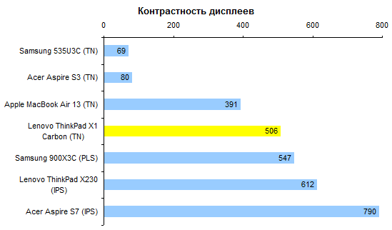 ⇡#Тестирование — дисплейВ серийных ноутбуках Lenovo ThinkPad X1 Carbon используется матрица с тем же номером модели, что и в протестированном ранее инженерном семпле, — LG LP140WD2(TL)(E2). Несмотря на это, результаты измерения параметров дисплея в этот раз ощутимо отличаются. Скажем, светимость белого поля в центре дисплея стала примерно на 10% ниже: для серийного ноутбука она составляет около 290 вместо 335 кд/м2 для демонстрационного образца. ![]() При этом светимость черного поля в той же точке снизилась сразу на 30%. Была 0,83 кд/м2 , а стала — всего лишь 0,58! ![]() Соответственно, контрастность дисплея серийного Lenovo ThinkPad X1 Carbon составляет порядка 500:1. ![]() Матрица принадлежит к типу TN, так что по ширине углов обзора уступает IPS- и PLS-дисплеям. Но по сравнению с типичными для ноутбуков TN-матрицами дисплей X1 Carbon в этом отношении весьма хорош. Цветовой охват дисплея ThinkPad X1 Carbon очень широк, по площади он даже превышает стандартный треугольник sRGB. Однако охват сдвинут относительно sRGB, причем таким образом, что добиться идеального совпадения с помощью калибратора будет невозможно. Температура белого составляет около 9000 К — тем, кто привычен к теплому изображению, настоятельно рекомендуется калибровка. Гамма-кривые (черные линии на графике) дисплея Lenovo ThinkPad X1 Carbon в сравнении с идеальными (цветные линии). Точность цветопередачи весьма высока: из 48 тестовых оттенков сколько-нибудь серьезная проблема наблюдалась только с одним. ![]() В ноутбуках вообще и в ультрабуках в частности встречаются и более интересные дисплеи. Однако если вас интересует диагональ 14 дюймов, то здесь дисплей ThinkPad X1 Carbon, похоже, лучший. ![]() ![]() ⇡#Тестирование — производительностьХарактеристики сравниваемых ноутбуков
