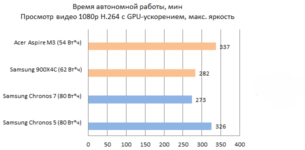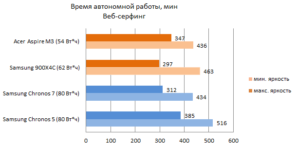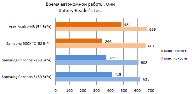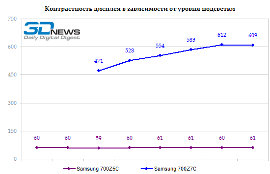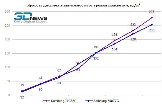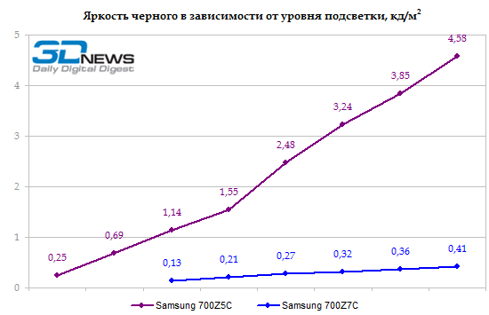 Ноутбуки различаются не только диагоналями экранов, но и «начинкой». В младшей модели установлен двухъядерный Core i5-3210M с номинальной частотой 2,5 ГГц. Его вычислительной мощности хватит подавляющему большинству пользователей, но наиболее требовательные наверняка захотят большего. ![]() Упомянутое большее способна предложить 17-дюймовая модель: ее оснащают четырехъядерным Core i7-3615QM. ![]() Чипсет в обоих лэптопах одинаковый — Intel HM76 — бюджетненько, зато с USB 3.0 на борту. ![]() В обоих ноутбуках установлена двойная графическая система. В качестве производительного компонента выбраны видеоадаптеры NVIDIA. В Chronos 15 установлена GeForce GT 640M с одним гигабайтом памяти, в старшем, Chronos 17 — GeForce GT 650M с двумя. Следует отметить, что в обоих случаях использована быстрая память GDDR5, а не бюджетная DDR3. ![]() Графическая система Samsung 700Z5C ![]() Графическая система Samsung 700Z7C В обоих ноутбуках часть памяти (4 Гбайт) распаяна на материнской плате. Однако в единственный разъем расширения в «пятнашке» устанавливают модель объемом 2 Гбайт, а в «семнашке» — 4 Гбайт. ![]() Оперативная память Samsung 700Z5C ![]() Оперативная память Samsung 700Z7C Модуль памяти — это единственный компонент, который владельцам Chronos позволено менять самостоятельно. Добраться до всей остальной начинки гораздо сложнее. Для этого потребуется полностью разобрать корпус, и в данном случае процедура разбора достаточно неприятна: помимо десятка винтов, придется повозиться с весьма зловредными защелками. Компоновка младшей и старшей моделей Chronos различается не так уж сильно. Добавку внутреннего объема корпуса в модели 700Z7C конструкторы почти полностью потратили на более серьезную аудиосистему. На оригинале фотографии хорошо видно, что внутреннее название этих ноутбуков — не Chronos, а Nike Корпус обеих моделей изготовлен из пластика, декорированного тонким слоем металла. Жесткость конструкции не вполне соответствует тому, что вправе ожидать покупатели премиум-ноутбуков. Вероятно, в следующем поколении подобных ноутбуков Samsung таки придется использовать полноценный металлический корпус. ⇡#Тестирование — дисплейЕдинственное, что есть общего у дисплеев «пятнашки» и «семнашки» Chronos, — это покрытие: оно в обоих случаях матовое. Дальше идут сплошные различия: скажем, 15-дюймовый дисплей обладает разрешением 1600x900, а 17-дюймовый — 1920x1080. Максимальный уровень светимости белого для дисплея 700Z5C составляет 278 кд/м2, для экрана 700Z7C этот показатель чуть меньше — 253 кд/м2. Оба лэптопа имеют датчик освещенности и могут самостоятельно подстроить комфортный уровень яркости экрана под текущие условия освещенности. ![]() Светимость черного поля у дисплеев совершенно разная: более чем приличные 0,41 кд/м2 для «семнашки» и ужасающие 4,58 кд/м2 для «пятнашки». ![]() Если пересчитать эти цифры в более понятную контрастность, то получится порядка 60:1 для Chronos 15 и до 610:1 — для Chronos 17. ![]() Примерно в той же степени, что и контрастность, различается цветовой охват: у дисплея Samsung 700Z7C он почти совпадает с sRGB, а у дисплея Samsung700Z5C — немногим больше половины этого цветового пространства. ![]() ⇡#Тестирование — производительностьНачнем с оценки производительности компьютера по версии Windows. Здесь и далее результаты тестирования Samsung Chronos 15 приведены слева, результаты Chronos 17 — справа Синтетический тест PCMark’07 оба ноутбука сдали на отлично без каких-либо проблем. Старша