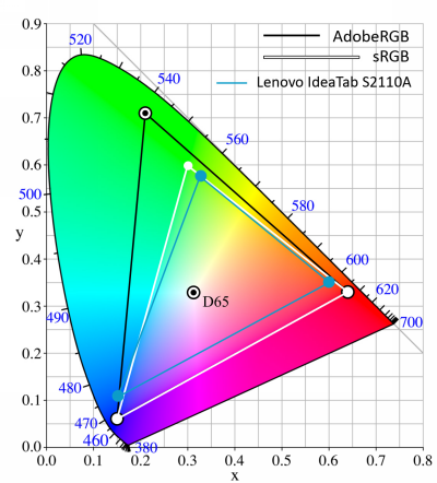 Информация о системе Lenovo IdeaTab S2110a ⇡#ЭкранНовинка от Lenovo обладает 10,1-дюймовым дисплеем с хорошими, но отнюдь не топовыми характеристиками. Разрешение экрана составляет 1280x800 точек (плотность пикселей, соответственно, — 149,5 на дюйм). Говоря откровенно, WXGA вполне достаточно, чтобы почти полностью скрыть зерно при работе с устройством на расстоянии согнутых в локтях рук. Однако его совершенно точно не хватит любителям помериться циферками «а у кого больше?». Благодаря вполне качественной IPS-матрице экран обладает отличными углами обзора, максимально приближенными к 180°. Сенсорная подложка у дисплея емкостная, она быстро и точно реагирует на прикосновения. Экран поддерживает до десяти одновременных нажатий и играючи справляется с мультисенсорными жестами.  Цветовой охват дисплея планшета Lenovo IdeaTab S2110a (бирюзовый треугольник) в сравнении с цветовой палитрой sRGB (белый треугольник) и цветовой палитрой Adobe RGB (черный треугольник) Экран Lenovo IdeaTab S2110a может похвастаться отличным запасом яркости. При ручном управлении максимальное значение подсветки белого поля составило 425 кд/м2, минимальное — 9,5 кд/м2. Разброс отличный, такие границы позволят комфортно пользоваться устройством как при ярком внешнем свете (здесь нужно поблагодарить антибликовую подложку), так и в полной темноте. Можно было бы подумать, что яркая подсветка плохо сказалась на насыщенности черного цвета. Тем не менее результат близок к стандартному — 0,66 кд/м2, то есть черный более-менее похож на черный. Средняя контрастность экрана составляет 675:1 — неплохо для портативного устройства, но стандартно для IPS. Цветовой охват экрана ощутимо уже палитры sRGB — 71,4%, но при работе с гаджетом не создается впечатления, что его дисплею не хватает сочности. Кино, фотографии — на экране устройства всё выглядит очень достойно: естественно и без цветовых искажений. ⇡#ПроизводительностьДля оценки вычислительной и графической мощности новинки мы использовали набор синтетических и игровых тестов из представленных в Google Play. Конкуренты для планшета Lenovo подобрались неслабые:  Samsung Galaxy Note 10.1  — планшет со схожим экраном, но несколько более мощной начинкой (четыре ядра против двух; два гигабайта оперативной памяти против одного).