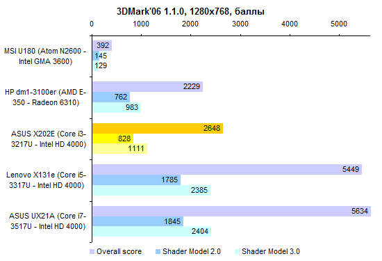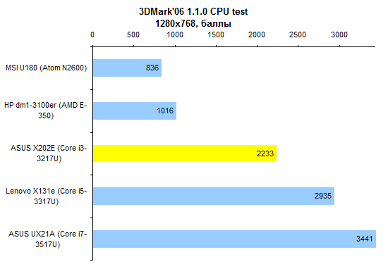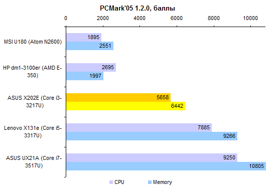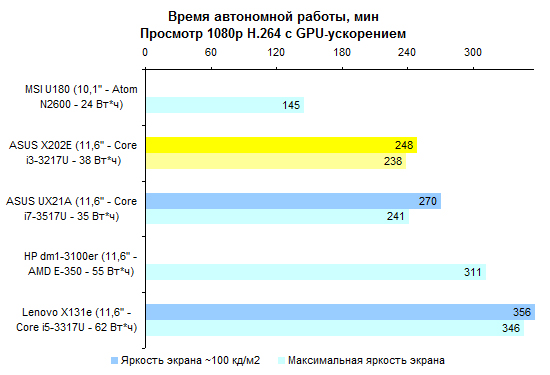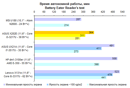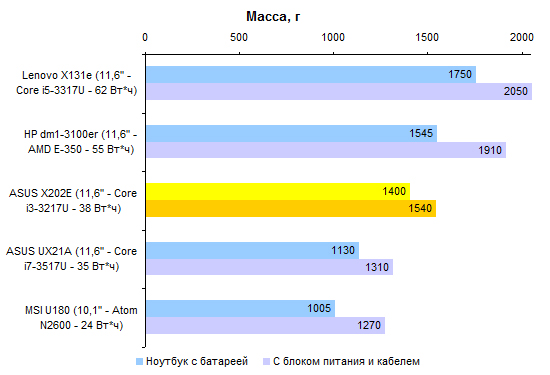 По производительности Core i3-3217U существенно уступает процессорам серий Core i5 и Core i7. Вместе с тем это гораздо более мощное решение, чем ЦП, предназначенные для использования в неттопах и нетбуках. ![]() ![]() В том числе это касается и производительности в графических приложениях. ![]() ⇡#Тестирование — масса, время автономной работыПлоские аккумуляторы постепенно становятся стандартом не только в ультрабуках, но и в более упитанных моделях. В частности, в VivoBook X202E использован аккумулятор, состоящий из двух плоских элементов питания суммарной емкостью около 38 Вт*ч. Одно из существенных достоинств данной модели — чрезвычайная компактность штатного блока питания. Адаптер не только маленький сам по себе, он предназначен для подключения непосредственно к розетке, поэтому избавляет от необходимости носить с собой еще и силовой кабель. В итоге масса адаптера составляет всего-навсего 140 грамм — примерно вдвое меньше, чем для большинства других ноутбуков. Сам по себе ASUS X202E весит не так уж и мало — 1400 грамм. Но по причине компактности адаптера масса полного комплекта получается весьма умеренной: самую малость больше полутора килограмм — практически «ультрабучный» результат. ![]() При низких нагрузках и минимальной яркости экрана ASUS VivoBook X202E способен проработать от батареи около шести часов. Повышение яркости до максимума снижает этот показатель на час с небольшим — ноутбуки с более высоким разрешением и максимальной яркостью куда чувствительнее к изменению данного параметра. При более высоких нагрузках можно смело рассчитывать где-то на 4 часа автономной работы. ![]() ![]() ⇡#ВыводыНа данный момент ASUS VivoBook X202E — самый доступный ноутбук, позволяющий в полной мере распробовать все «трогательные» нововведения Windows 8. Собственно, именно ради сенсорного экрана его и стоит покупать. Кроме того, при достаточно гуманной стоимости VivoBook X202E имеет некоторые особенности, характерные для более дорогих представителей модельного ряда ASUS. Редакция 3DNews благодарит компанию «Графитек» за предоставленный в распоряжение нашей лаборатории измерительный комплекс Spyder4Elite.