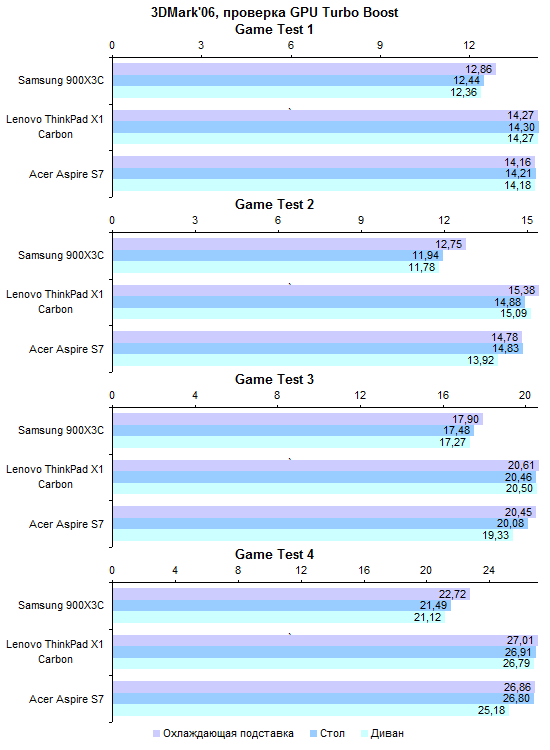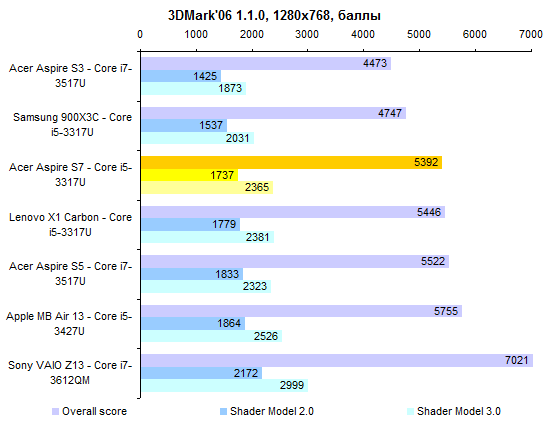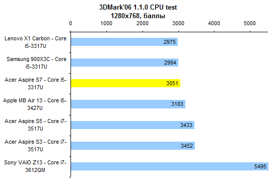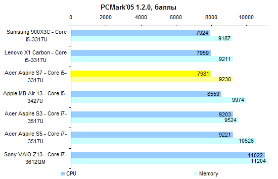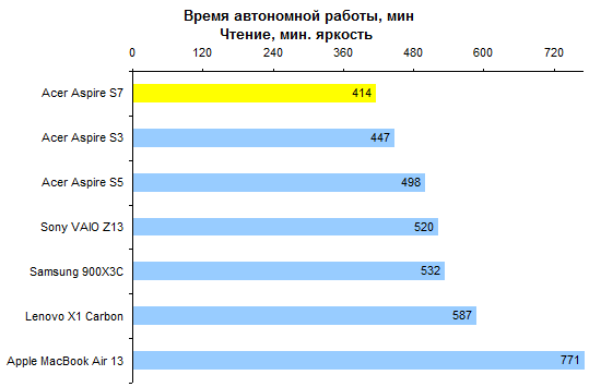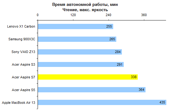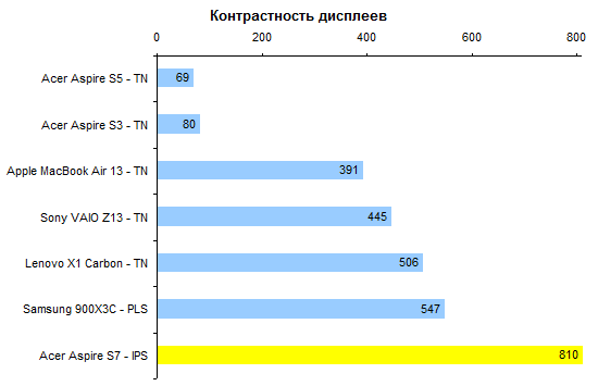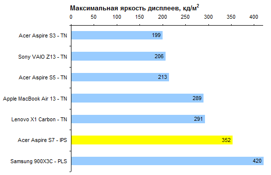 ⇡#Тестирование — дисплейПоследние пару лет в Acer предпочитали тотально экономить на качестве изображения дисплеев. Отчасти это было обусловлено не столько экономией денег, сколько снижением энергопотребления ноутбуков. Модель Aspire S7 — первая, в которой эта тенденция оказалась сломлена. Для флагманского ультрабука в Acer использовали чрезвычайно добротную IPS-матрицу AU Optronics B133HAN03.0. Максимальная яркость составляет около 350 кд/м2. Этого будет вполне достаточно в большинстве случаев, кроме, разве что, работы на тропическом солнцепеке. Но в таких условиях большую роль будет играть другая проблема — бликующее защитное стекло. ![]() А вот показатель светимости черного поля — один из самых низких среди всех протестированных нами к этому моменту ноутбуков. При максимальном уровне подсветки он составляет всего лишь 0,44 кд/м2. Черный чернее в ноутбуках мы видели всего два раза: при тестировании мобильной рабочей станции HP Elitebook 8760w, которая стоила примерно как стратегический бомбардировщик, и игрового Samsung 700G7A с несколько более гуманным, но тоже вполне аэрокосмическим ценником. ![]() Соответственно, итоговая контрастность — рекордная, 810:1 с плавным снижением до 700:1 ближе к минимальному уровню подсветки. ![]() Цветовой охват не рекордный, около 74% от пространства sRGB. Впрочем, большинство конкурентов обладает сходным охватом: скажем, дисплей MacBook Air отображает лишь 65% от sRGB. ![]() ![]() Гамма-кривые дисплея Acer Aspire S7 (черные линии на графике) в сравнении с идеальными (цветные линии) Достаточно высока точность цветопередачи: в среднем по использованным в тесте 48 оттенкам ΔЕ не превышает единицу. ![]() Если говорить о сравнении с конкурентами, то расклад таков: из протестированных нами ультратонких ноутбуков с диагональю дисплея 13-14″ превзошел героя этого обзора по максимальной яркости лишь Samsung 900X3C. ![]() По контрастности же дисплей Acer Aspire S7 значительно лучше всех экранов конкурентов. ![]() Правда, следует помнить о том, что матрица Aspire S7 обладает разрешением Full HD. Плюсы очевидны — картинка выглядит чрезвычайно гладко и не режет глаз пикселем. Однако масштабирование интерфейса приложений в Windows даже с выходом «восьмерки» не стало идеальным, так что иногда высокая плотность пикселей может превращаться в проблему. ⇡#Тестирование — производительность
