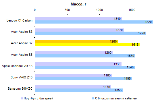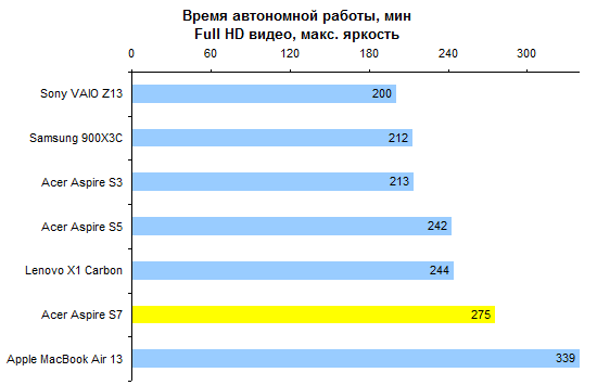 По процессорной производительности среди ультратонких ноутбуков 2012 года лидер очевиден — это Sony VAIO Z12, который оснащают четырехъядерным Core i7-3612QM. Правда, такие результаты достигаются ценой ужасного акустического дискомфорта: шумит «зетка», как крупная бормашина. Acer Aspire на порядок тише. Рекордов он не ставит, но для всех типичных задач, кроме разве что игр, его мощности вполне хватит. ![]() ![]() ![]() Интересно, что удивительно эффективной оказалась система охлаждения Aspire S7. Она позволяет встроенному в процессор графическому ядру оставаться в разогнанном состоянии значительно дольше, чем система охлаждения Samsung 900X3C. ![]() Несмотря на идентичные процессоры (и, следовательно, идентичную графику), Aspire S7 оказывается заметно производительнее в графических тестах, чем сверхтонкий ноутбук корейской компании. Lenovo ThinkPad X1 Carbon в этом отношении еще лучше — но это и неудивительно, его корпус гораздо просторнее. ⇡#Тестирование — батареяКак это свойственно всем ультрабукам — и особенно наиболее тонким из них — аккумулятор занимает более половины внутреннего объема корпуса. Однако батарея чрезвычайно тонкая, так что даже при таких горизонтальных размерах ее не удалось сделать по-настоящему мощной. Емкость составляет около 35 Вт*ч, столько же, сколько и в двух других ультрабуках Acer — Aspire S3 и Aspire S5. Большинство конкурентов обладает батареей с емкостью на 30-50% большей. В Acer Aspire S7 очень много принесено в жертву снижению массы и толщины корпуса — от только что упомянутого аккумулятора до целого ряда клавиш. На фоне этого стандартный блок питания мощностью 65 Вт, с толстым трехжильным кабелем для подключения к розетке, выглядит откровенным издевательством. Так что суммарная масса полного комплекта достаточно велика — 1,6 килограмма с небольшим. И это несмотря на то, что сам по себе ультрабук весит несколько меньше нормы для своего класса. ![]() Что касается времени автономной работы, то с ним дела обстоят неоднозначно. Невысокая емкость аккумулятора и не самая экономичная ЖК-матрица дают о себе знать, так что в режиме минимального энергопотребления с минимальной же яркостью экрана Acer Aspire S7 работает меньше всех сравнимых моделей. ![]() Однако если выкрутить подсветку на максимум, то время работы уменьшается не так сильно, как у других ультрабуков, — и относительные результаты становятся заметно лучше. ![]() В свою очередь, в тесте с воспроизведением Full HD при максимальной яркости Aspire S7 занимает второе место после MacBook Air 13, работающего под управлением тщательно оптимизированной Mac OS. ![]() В целом по сравнению с другими ультрабуками результаты достаточно неплохие. Однако абсолютные значения времени автономной работы устроят не всех. Поскольку улучшить результаты с помощью каких-либо операций с внутренним аккумулятором невозможно, в Acer предусмотрели возможность подключения внешней батареи. Батарея цепляется под днище и привинчивается двумя винтами. Подключается она через разъем на левом боку корпуса ультрабука, что наносит некоторый ущерб эстетическому аспекту. На правой стороне аккумулятора имеется аппаратный индикатор заряда. ![]() Батарея имеет такую форму, чтобы не перекрывать вентиляционные отверстия, расположенные в задней части корпуса. Помимо всего прочего, она играет роль подставки, слегка разворачивая клавиатуру в сторону пользователя. Прекрасн