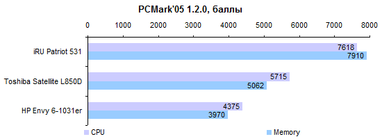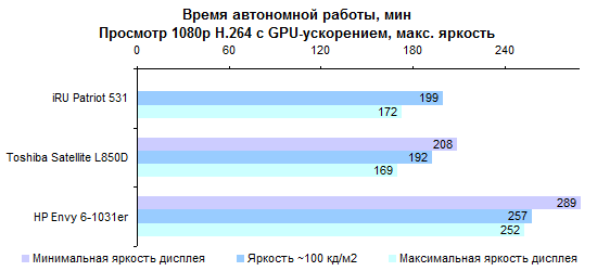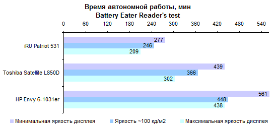 Даже старшие чипы AMD, основанные на архитектуре Piledriver, обладают не слишком высокой процессорной производительностью. Что уж говорить о низковольтной модификации. Это, конечно, не Intel Atom. Но даже по сравнению с Core i3 результаты весьма бледные. ![]() ![]() Производительность встроенного в процессор графического ядра также сравнительно невысока: Radeon 7500G немного уступает Radeon 7520G. И оба они оказываются гораздо медленнее, чем дискретный видеоадаптер GeForce GT 630M, с которым, если судить по номеру модели, им положено конкурировать. ![]() ![]() ![]() ![]() ![]() ![]() ![]() ⇡# Тестирование — масса, время автономной работыАккумулятор HP Envy 6-1031er построен из четырех плоских элементов питания. Суммарная емкость достаточно велика: 60 Вт*ч. Более суровые европейские и японские правила требуют указывать минимальную емкость вместо номинальной — в данном случае она примерно на 4% ниже, 3900 мА*ч, а не 4050 Ноутбук комплектуется обычным для этого класса устройств блоком питания мощностью 65 Вт. Адаптер подключается к розетке с помощью толстого трехжильного кабеля. В данном случае кабель еще и длинный — весит целых 170 граммов. Таким образом, суммарная масса зарядного устройства и кабеля составляет 410 граммов. Сам ноутбук достаточно легкий, наш экземпляр потянул всего лишь на 2,1 килограмма. Но с учетом блока питания и кабеля он весит уже чуть больше 2,5 кило. Те модели, которые мы выбрали для сравнения, весят «в полной выкладке» примерно столько же — несмотря на то, что сами «тушки» ощутимо тяжелее. Вот такая она, магия правильных и неправильных блоков питания. Что печально, из официальных характеристик о таких подводных камнях никогда не узнаешь. ![]() Емкая батарея позволяет HP Envy Sleekbook 6 достаточно долго работать от одного заряда. ![]() Повышенная прожорливость графического ядра серьезно портит результаты в режиме просмотра Fill HD-видео. И все-таки даже в этом сценарии результаты неплохие. ![]() ⇡# ВыводыИз-за использованной платформы HP Envy Sleekbook 6-1031er получился излишне медленным по меркам 15-дюймовых моделей. С другой стороны, чип AMD позволил обеспечить конкурентоспособную цену и хорошее время автономной работы. Учитывая, что «основа» для данной ценовой категории достаточно хороша, предложение в итоге получилось весьма заманчивым: не так-то просто найти за такие деньги тонкую и легкую «пятнашку» с породистым дизайном. Редакция 3DNews благодарит компанию «Графитек» за предоставленный в распоряжение нашей лаборатории измерительный комплекс Spyder4Elite.