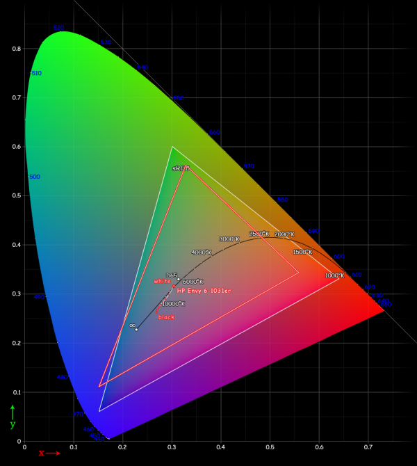 С ноутбуком HP Envy 6 мы уже встречались в одном из прошлых обзоров. Правда, тогда он был основан на платформе Intel, носил титул ультрабука и полностью назывался HP Envy Ultrabook 6-1051er. Теперь же у нас на повестке дня версия на чипе AMD. Совершенно очевидно, что зваться ультрабуком она никак не может, поэтому в HP для обозначения тонкости, легкости и прогрессивности таких конфигураций Envy 6 придумали собственный термин — «сликбук». Полное название модели, которую мы сегодня рассмотрим, звучит так: HP Envy Sleekbook 6-1031er. Различается в этих двух ноутбуках только начинка. А все, что можно увидеть глазами или потрогать руками, — идентично. Есть ощущение, что стоимость «основы» ноутбука такова, что покупатели версии Ultrabook немного переплачивают за итоговое качество. А вот покупатели Sleekbook — напротив, получают чуть больше, чем заплатили. Потому что в ценовой категории «около $1 000» есть достаточно много интересных моделей. А вот в более приземленной нише «$500–600» с ними напряженка. И за такие деньги HP Envy 6 — вероятно, самый привлекательный внешне и наиболее аккуратно спроектированный ноутбук. На первый взгляд, корпус имеет достаточно сложную форму — поэтому может показаться, что определить его истинную толщину не так уж просто. Но на деле расстояние между нижней и верхней поверхностями более-менее постоянно. Так что если забыть о скошенных участках спереди и сзади, задача существенно упрощается. Таким образом, толщина составляет 22 миллиметра с учетом ножек и 20 миллиметров — если их не учитывать. Производителем заявлена толщина корпуса 19,8 мм. Ножки, как обычно, не посчитали В отличие от большинства 15-дюймовых моделей, в Envy 6 использована клавиатура без «бухгалтерской добавки» — выделенного блока цифровых клавиш. С одной стороны, это очевидный недостаток для тех, кто часто пользуется цифровыми клавишами. С другой стороны, из данного факта есть два приятных следствия. Во-первых, клавиатура получилась более просторной, чем это обычно бывает при наличии упомянутого блока. Во-вторых, сенсорную панель традиционно размещают под пробелом, поэтому в «бухгалтерских» моделях она сильно съезжает влево — не всем это нравится, вероятно особенно недовольны левши. В данном же случае тачпад размещен точно по центру корпуса. Сенсорная панель — самая крупная из всех, которые нам встречались. Размеры чувствительной области составляют 110 на 68 миллиметров, и это рекорд одновременно по каждому из двух измерений. Такое ощущение, что конструкторам поставили задачу сделать самую большую сенсорную панель — и они ее успешно решили. Нарисованная черта по факту ничего не отделяет: чувствительная область распространяется в том числе и на «кнопки» Благодаря «ампутации» оптического привода, на бортах Envy 6 осталось немало места для коммуникационных разъемов. Поместились не только три USB-порта, два из которых обладают поддержкой USB 3.0, но даже такая диковинная для тонких моделей штука, как RJ-45. Есть даже два раздельных аудиоразъема — в последнее время их все чаще объединяют в комбинированный. В большинстве компактных моделей устройства чтения карт памяти с укороченным отсеком — карточки торчат из них примерно на половину длины. В HP Envy 6 слот полноразмерный, карта утапливается в него полностью. Проводные коммуникации дополнены стандартной парой беспроводных интерфейсов: Bluetooth 4.0 и Wi-Fi с по