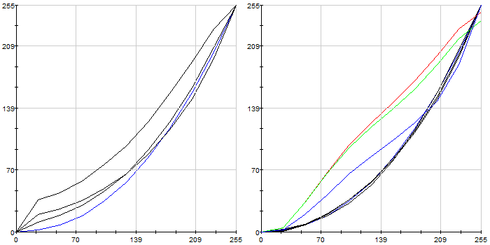 Гамма-кривые (чёрные графики), полученные до и после калибровки дисплея LG, целевая гамма 2,2 (светло-синий график) и коррекция для каждого цвета (красный, синий, зелёный)