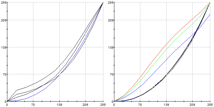 Гамма-кривые (чёрные графики), полученные до и после калибровки дисплея Samsung, целевая гамма 2,2 (светло-синий график) и коррекция для каждого цвета (красный, синий, зелёный)