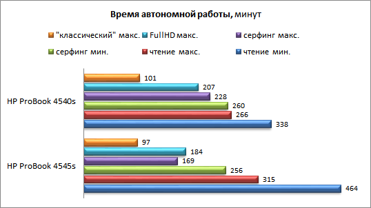 В HP ProBook 4540s и 4545s использованы одинаковые съемные аккумуляторы, построенные на цилиндрических элементах питания. Емкость батареи в обоих случаях составляет 47 Вт*ч. Не очень много, но для настолько недорогих ноутбуков — вполне нормально. В режиме "чтения" версия на платформе AMD способна прожить ощутимо дольше, особенно при минимальном уровне подсветки, но достаточно даже малейшей нагрузки, чтобы она уступила первенство.