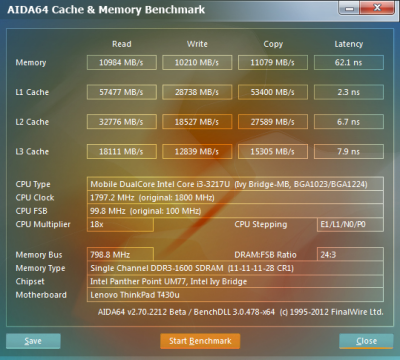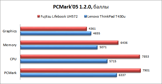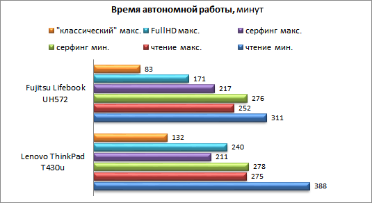 Как видите, NVIDIA GeForce GT 620M обеспечивает вполне ощутимую прибавку производительности по сравнению с интегрированными адаптерами Intel. ⇡# Тестирование: время автономной работыНесмотря на довольно суровую толщину корпуса и немалую массу, ожидать высокой емкости аккумулятора или хотя бы возможности его оперативной замены в данном случае не стоит. Тонкий 3-элементный аккумулятор ёмкостью 47 Вт*ч традиционно для ультрабуков не имеет корпуса и установлен так, что поменять его на ходу не получится. Однако, в отличие от большинства тонких моделей, в ThinkPad T430u до батареи довольно легко добраться, открутив всего несколько винтов. Так что с заменой вышедшего из строя или «уставшего» от долгой жизни аккумулятора можно справиться самостоятельно, не обязательно обращаться в сервисный центр. ![]() Обратная сторона низкого качества изображения использованного в ThinkPad T430u дисплея — его невысокое энергопотребление. Оно позволяет оснащенному не самым емким аккумулятором и лишенному SSD ноутбуку довольно долго работать от одного заряда батареи. Конечно, хочется, чтобы он работал еще дольше, — но это общее желание владельцев всех без исключения тонких ноутбуков. ⇡# ВыводЗачастую ноутбуки бизнес-серий ThinkPad оставляют весьма приятные впечатления, поэтому по поводу T430u у нас были, возможно, завышенные ожидания. Однако минусов у первого бизнес-ультрабука Lenovo оказалось больше, чем хотелось бы. Во-первых, стоит отметить корпус, который обладает недостаточно высокой жёсткостью и при попытках скручивания весьма активно потрескивает. Во-вторых, клавиатура оказалась довольно податливой, её основание прогибается при сильном давлении на центральные клавиши. Но это всё мелочи — настоящим разочарованием стал дисплей. К недостаткам матрицы стоит отнести невысокую максимальную яркость, очень низкую контрастность, посредственную цветопередачу и узкие углы обзора. Спасибо, хоть матовый. Длительность автономной работы средняя, поэтому её нельзя причислить ни к недостаткам, ни к достоинствам ультрабука. В общем, из плюсов у T430u есть только неплохая производительность видеоподсистемы, два манипулятора (сенсорная панель и трекпоинт), а также классический дизайн линейки ThinkPad, но в тонком корпусе. Тонком, но не таком уж и легком — по сравнению с ThinkPad X1 Carbon эта модель тяжелее на целых полкило. Редакция 3DNews благодарит компанию «Графитек» за предоставленный в распоряжение нашей лаборатории измерительный комплекс Spyder4Elite и украинское представительство Lenovo за предоставленный ноутбук Lenovo ThinkPad T430u