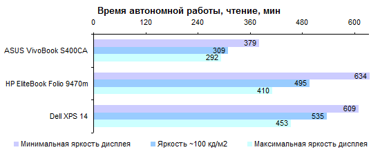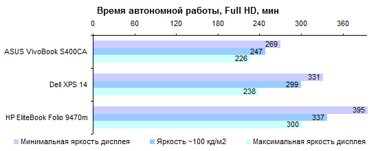 ![]() ![]() ![]() Тестирование — масса, время автономной работы Аккумулятор HP EliteBook Folio 9470m собран из плоских элементов питания и обладает емкостью 52 Вт*ч. Но, в отличие от большинства ультрабуков, в тонком ноутбуке HP он съемный. С одной стороны, это недостаток: аккумулятор оказывается тяжелее, чем несъемные батареи, и занимает больше места. С другой стороны, возможность на ходу заменить источник питания многие могут посчитать весьма ценной. Тем более что для любителей запастись батарейками в Folio 9470m есть еще одна приятная опция: на днище можно прицепить второй аккумулятор емкостью 60 Вт*ч. Суммарный запас энергии в таком случае составит 112 Вт*ч — страшно подумать, сколько ультрабук сможет проработать от двух батарей. Разъем для подключения второго аккумулятора на дне ноутбука Блок питания обладает невысокой мощностью — 45 Вт — и, соответственно, несколько более скромными размерами, чем обычные 65-ваттники, которыми комплектуют многие модели такого рода. Масса HP EliteBook Folio 9470m довольно высока по меркам ультрабуков. С другой стороны, не стоит забывать о более высоком уровне прочности, функциональности, расширяемости и ремонтопригодности ноутбука — все лишние граммы имеют именно это происхождение. Каков процент пользователей, которым это действительно нужно, — другой вопрос. ![]() Использование экономичного дисплея, а также — в данной конфигурации — твердотельного накопителя имеет приятное следствие: несмотря на не такую уж высокую емкость аккумулятора, HP Folio 9470m работает от одного заряда весьма долго по меркам ультрабуков. ![]() При воспроизведении Full HD-видео, к примеру, можно с уверенностью рассчитывать на 5 часов непрерывного просмотра. Очень хороший результат. Если добавить второй аккумулятор, то хватит не только на полный рабочий день, но и на дорогу с работы и обратно. ![]() По сути, HP EliteBook Folio 9470m представляет собой стандартную 14-дюймовую корпоративную модель хорошего уровня, со всеми присущими ей возможностями и функциями. Только на 500-800 граммов легче. Вероятно, с ультрабуками начинать надо было именно с чего-то такого, ведь работягам легкие и удобные ноутбуки нужнее, чем домашним пользователям. Однако Intel все изрядно запутала, так что появление корпоративных ультрабуков сильно задержалось. Недостаток у HP Folio 9470m, по большому счету, всего один: это крайне посредственный дисплей. Если качество изображения для вас является важным критерием, рекомендуем обратить внимание на другие модели. Однако тем, кто больше ценит расширяемость и функциональность, советуем присмотреться к Folio 9470m: если дисплей устроит, то все остальное вам уж точно понравится. Редакция 3DNews благодарит компанию «Графитек» за предоставленный в распоряжение нашей лаборатории измерительный комплекс Spyder4Elite.