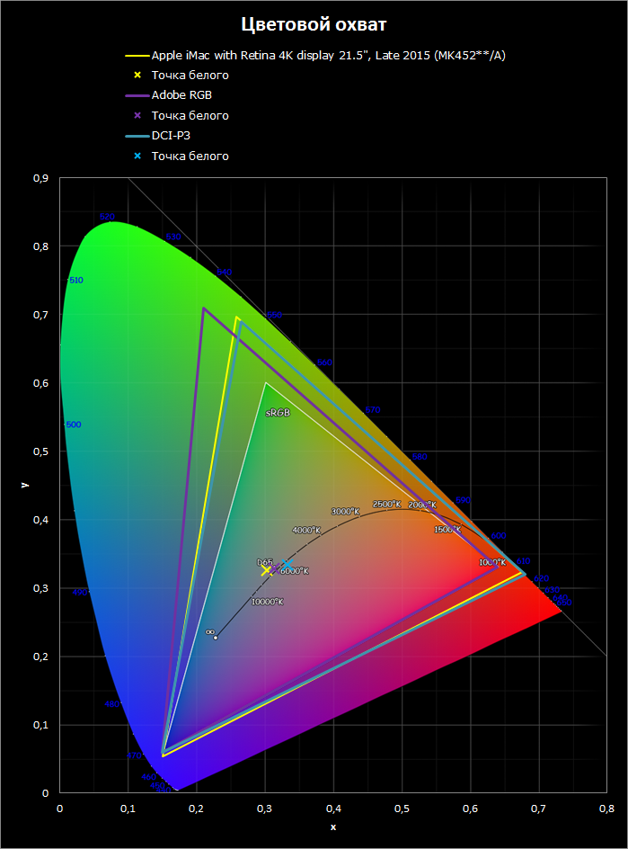 Спустя год после выпуска iMac с 5К-экраном Apple взялась в очередной раз обновлять семейство настольных моноблоков. Обе модели – с диагональю 21,5 и 27 дюймов – перешли на процессоры Intel Broadwell и Skylake соответственно (почему такая разница, мы обсудим отдельно), но главная новость в очередной раз связана с экранами. И в том и в другом iMac цветовой охват матрицы соответствует стандарту DCI-P3 с 30-битным кодированием цвета, а 21,5-дюймовый iMac удостоился экрана с разрешением 4096 × 2304. У наших постоянных читателей в данный момент уже должно возникнуть несколько вопросов. Зачем Apple все еще связывается с Broadwell, когда есть Skylake? Откуда взялось разрешение 4096 × 2304 и что такое DCI-P3? Давайте разбираться. Технические характеристики Начнем со скучной части. Apple довольно давно (с 2013 года) не обновляла аппаратную платформу 21,5-дюймового iMac, который комплектовался четырехъядерными процессорами Core i5 и i7 поколения Haswell. В промежутке был выпущен только iMac «совсем начального» уровня на базе двухъядерного Core i5 с базовой частотой 1,4 ГГц (таким образом, по производительности эта модель сопоставима с современным ей MacBook Air). Среди 21,5-дюймовых iMac конца 2015 года есть как «ретиновые», так и модификации со стандартным экраном Full HD (в то время как в 27-дюймовый iMac устанавливают уже только «ретину»). И все они перешли на CPU с ядром Broadwell. Срок жизни Broadwell в качестве новейшей архитектуры процессоров Intel был кратким в связи с недавним выходом чипов Skylake, однако Broadwell в данный момент занимает нишу, в которую еще не проник его наследник, – это процессоры с мощной интегрированной графикой Iris Pro и дискретным кешем четвертого уровня, известным под кодовым именем Crystalwell. Для младших моделей iMac, лишенных дискретного GPU, это необходимое условие. А если вспомнить, что Skylake не принес существенного прироста производительности за пределами мобильного (скорее даже ультрамобильного) сегмента, то выбор в пользу «уходящей» платформы CPU для iMac вполне простителен. Для iMac с 27-дюймовым экраном, напротив, уже есть процессоры Skylake с подходящими частотами, а графику там обслуживает дискретный GPU от AMD. Получается вполне логично: в 21,5-дюймовых iMac без дискретной графики, где от процессорного видеоядра нужна серьезная производительность, используется Broadwell, а в 27-дюймовых с дискретной видеокартой — более совершенные во всем, кроме GPU, чипы Skylake. Смена Haswell на Broadwell принесла более высокие тактовые частоты (Core i5 с базовой частотой 3,1 ГГц и Core i7 – с 3,3 ГГц) по сравнению с предыдущим поколением 21,5-дюймовых iMac (Core i5 или Core i7 с базовыми частотами от 2,7 до 3,1 ГГц) и более быструю графику Iris Pro 6200 вместо Iris Pro 5200.
