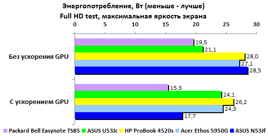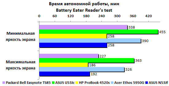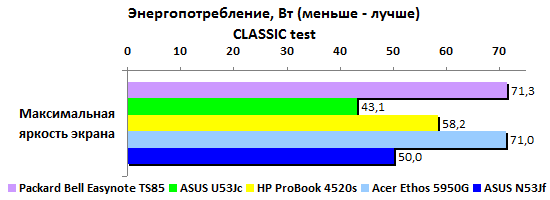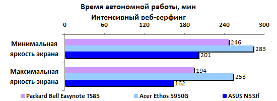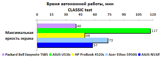 В режиме максимальной нагрузки на систему ASUS N53Jf может проработать порядка часа — достаточно неплохой результат для ноутбука с такой начинкой и таким аккумулятором.