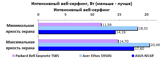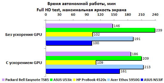 Если активно работать в Cети, то в вашем распоряжении окажется порядка 3 часов плюс-минус 15 минут в зависимости от яркости экрана. У ноутбуков на Sandy Bridge при таком сценарии использования «расход» ниже.