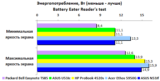 Результаты тестов автономной работы не особенно впечатляют. В режиме минимальной нагрузки на систему ноутбук способен продержаться 3-4 часа — в зависимости от уровня подсветки дисплея.