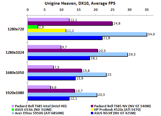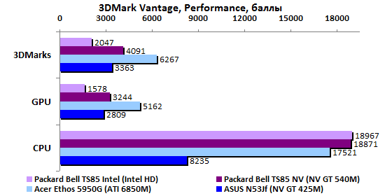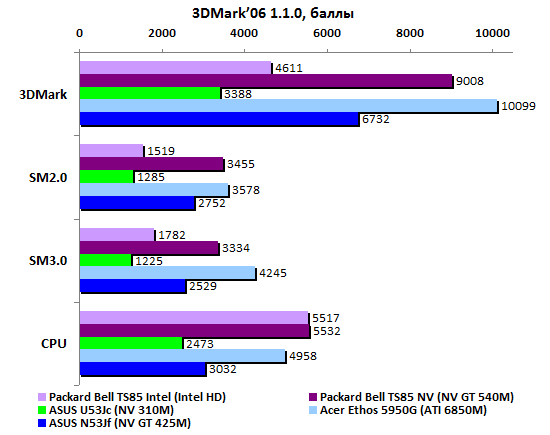 А вот графика во всех версиях ASUS N53Jf одна и та же, так что тесты 3D-производительности вполне актуальны. GeForce GT 425M — адаптер далеко не самый мощный, и по результатам это отлично видно. Впрочем, по сравнению с интегрированной графикой Intel нового поколения и дискретными решениями начального уровня, GT 425M обладает вполне неплохой производительностью.