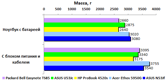 Ноутбук достаточно тяжелый: масса вместе с аккумулятором переваливает за 3 килограмма. В комплекте с блоком питания — даже чуть больше 3,5 кг. Конечно, это не слишком критично для настольной модели. Но у конкурентов при той же начинке получаются более легкие ноутбуки, а при той же массе — более производительные. Конструкторам ASUS стоило бы что-то с этим сделать. Все же при прочих равных менее тяжелый ноутбук выглядит предпочтительнее.