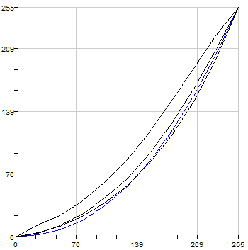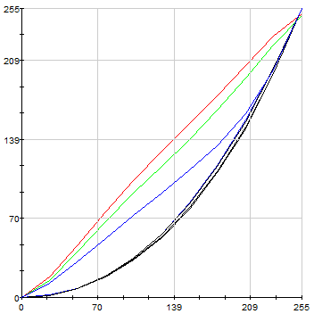 На иллюстрации, приведённой ниже, отображены гамма-кривые (чёрные графики), полученные до и после калибровки дисплея, целевая гамма 2,2 (светло-синий график) и коррекция для каждого цвета (красный, синий, зелёный).