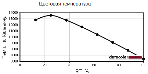 Также после калибровки была измерена зависимость цветовой температуры от уровня яркости при целевом значении 6500K. Как видно на графике, при уменьшении яркости цветовая температура резко растёт.