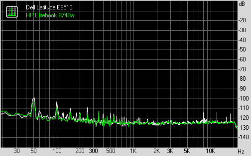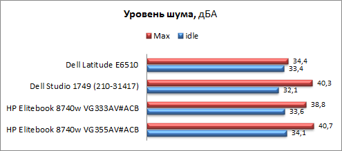Ноутбук основан на довольно мощном процессоре Intel Core i7-620M, к тому же размеры и вес ноутбука невелики, поэтому ожидалось, что подопытный окажется довольно шумным, но оказалось совсем наоборот. Dell Latitude E6510 - просто тихоня, и максимальный уровень генерируемого шума на расстоянии 20 см от центра переднего края не превышает 34,4 дБА! Отличный показатель. А вот в режиме простоя и невысоких нагрузок ноутбук не самый тихий - 33,4 дБА, т.е. разница между максимальным и минимальным уровнем генерируемого шума не превышает 1 дБА, кроме того, изменение скорости вращения крыльчатки происходит довольно плавно, поэтому нередко это изменение можно просто не заметить. В общем, в плане акустического комфорта ноутбук заслуживает «пятёрку» с небольшим минусом. Ниже приведена сводная диаграмма уровня шума в режиме простоя и в режиме максимальной нагрузки для ноутбуков HP Elitebook 8740w в модификациях VG355AV#ACB и VG333AV#ACB, а также Dell Latitude E6510.