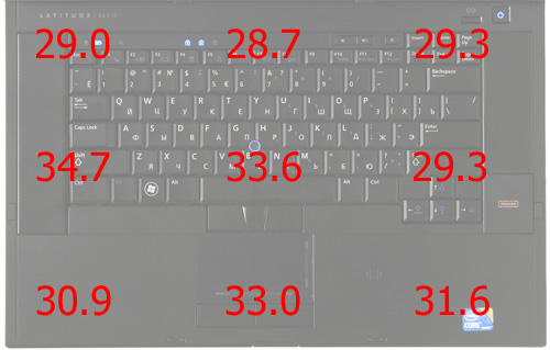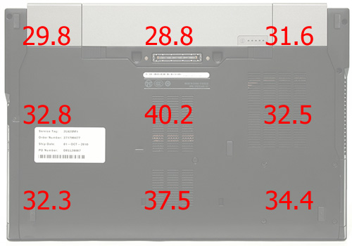С нагревом корпуса ситуация несколько хуже, что напрямую связано с низким уровнем создаваемого шума. Замеры уровня нагрева корпуса осуществлялись при температуре окружающей среды +21 градус Цельсия в девяти точках днища и в девяти точках рабочей области после 30-минутного прогона пакета 3DMark 2006. Рабочая область разогревалась до 28,7-35,0 градуса, причём самой горячей зоной оказалась сенсорная панель. Днище разогревается ещё больше – до 28,8-40,2 градуса, а самая горячая зона находится по центру, в районе модулей памяти. Нагрев довольно велик, но не стоит забывать, что тестируемый ноутбук – это довольно лёгкий среднеформатник на базе мощного процессора, а в такой ситуации чем-то приходится жертвовать.