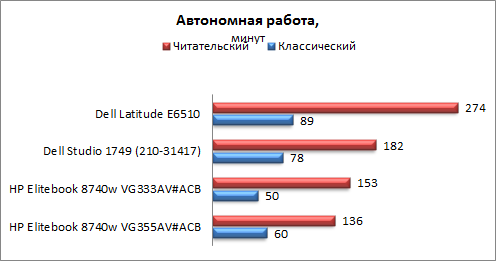 Для возможности сравнения ниже приведёна диаграмма времени автономной работы в режимах «классический» и «читательский» для следующих мобильных ПК: