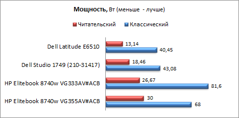 В связи с тем, что оппоненты оснащены аккумуляторами различной емкости, было решено добавить сравнительную диаграмму, демонстрирующую потребление энергии в режимах "классический" и "читательский" пакета Battery Eater Pro.