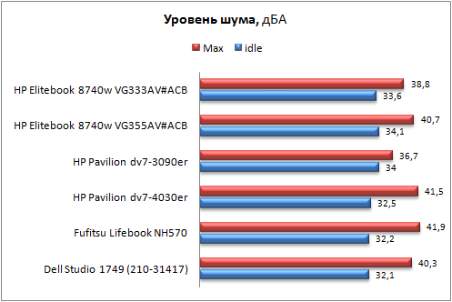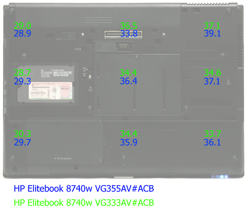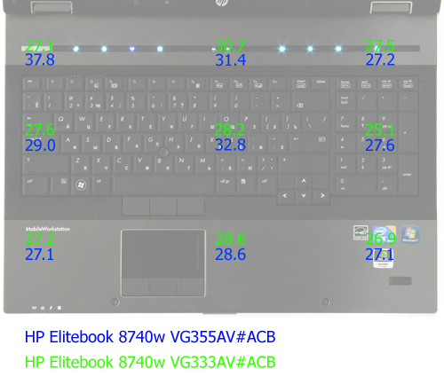 ⇡#КоммуникацииОба ноутбука оборудованы одинаковыми модулями Wi-Fi (802.11 a/b/g/n) и Bluetooth, но лишь v2.1, тогда как уже даже в некоторых бюджетных ноутбуках HP доступен Bluetooth 3.0. Также обе модификации оборудованы совершенно одинаковыми гигабитными Ethernet-контролерами и модемами на базе Agere Si3054. ⇡#Уровень шума и тепловой режимОба ноутбука кажутся довольно тихими, но это скорее связанно с особенностями алгоритмов работы активной составляющей охлаждающей системы, которые предусматривают редкую смену скоростей вращения кулера, но между алгоритмами, да и уровнем шума тестируемых модификаций, всё же есть отличия. Модификация с картой NVIDIA оказалась более шумной, и даже в режиме простоя и невысокой нагрузки уровень шума достигает отметки 34,1 дБА, при кратковременных высоких нагрузках (до 20 секунд) скорость вращения кулера также не изменяется, а вот при длительных нагрузках уровень генерируемого шума сначала повышается до 37,6 дБА, а при максимальных нагрузках на процессор и видеоядро до 40,7 дБА, что уже ощутимо даже в шумном офисном помещении. Скорость вращения изменяется плавно как на повышение, так и на понижение, к тому же смена скоростей происходит редко, поэтому особого дискомфорта не вызывает. Модификация на базе видео ATI оказалась не только тише, но алгоритм работы оказался ещё более удачным. При невысоких и даже достаточно длительных (до минуты) высоких нагрузках уровень шума минимален – до 33,6 дБА. Переход на следующую ступень происходит значительно позже, чем у ноутбука на базе видео NVIDIA, кроме того, уровень шума при средней скорости вращения куллера ниже – до 35,6 дБА. При длительных высоких нагрузках уровень шума достигает отметки 38,8 дБА, что для столь мощного мобильного ПК является вполне приемлемым показателем. Как и в случае модификации на базе видео NVIDIA скорости вращения кулера изменяются достаточно плавно. Ниже приведена сводная диаграмма уровня шума в режиме простоя и в режиме максимальной нагрузки для HP Pavilion dv7-3090er и HP Pavilion dv7-4030er, Dell Studio 1749 (210-31417), Fujitsu Lifebook NH570 и обоех тестируемых модификаций. Измерение уровня шума производилось на расстоянии 20 см от центра передней панели.  Сводная таблица уровня шума в режиме простоя и в режиме максимальной нагрузки Замеры уровня нагрева корпуса осуществлялись при температуре окружающей среды +21 градус Цельсия в девяти точках днища и в девяти точках рабочей области после 30-минутного прогона пакета 3DMark 2006. Рабочая область HP Elitebook 8740w VG355AV#ACB в зависимости от точки измерения разогревалась до 27,1- 37,8 градуса, а днище - до 29,3-39,1 градуса. HP Elitebook 8740w VG333AV#ACB греется чуть меньше: рабочая область до 25,1-30,7 градуса, а днище - до 28,7-37,1 градуса. В общем, нагрев для обеих модификаций значительно выше среднего, но, учитывая мощность компонент, либо уровень шума, либо нагрев должны были быть высокими.  Температурный режим. Днище  Температурный режим. Рабочая область ⇡#ПроизводительностьДля возможности сравнения производительности в качестве оппонентов из нашей базы результатов были взяты следующие мобильные ПК: