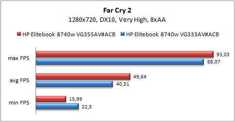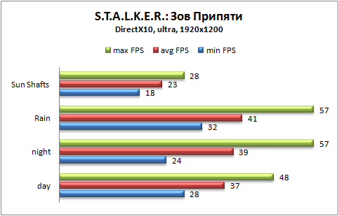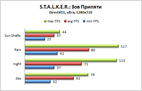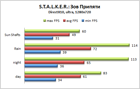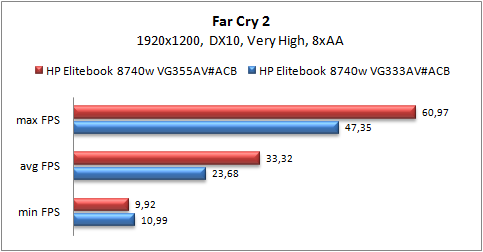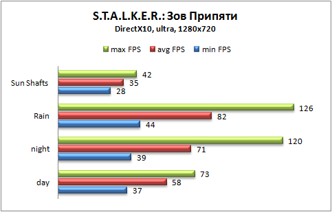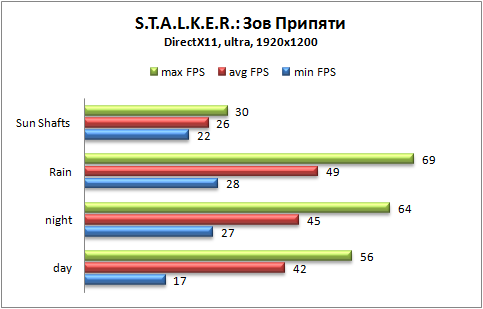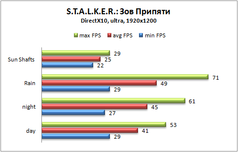 Производительность системы была измерена в играх S.T.A.L.K.E.R.: Зов Припяти и Far Cry 2 при помощи распространяемых с играми тестовых пакетов. В бенчмарке Far Cry 2 тестовая сцена «Ranch Long» запускалась пять раз, в таблицы результатов вносились усреднённые данные. Бенчмарк S.T.A.L.K.E.R.: Зов Припяти запускался единожды, но одна и та же сцена прогонялась при различных погодных условиях. Запуск тестовых сцен для всех игровых бенчмарков производился при максимально допустимом разрешения 1920х1200, а также, для возможности сравнения в будущем, при разрешении 1280х720 точек. Модификация на базе видео ATI также дополнительно была протестирована при использовании DirectX 11.