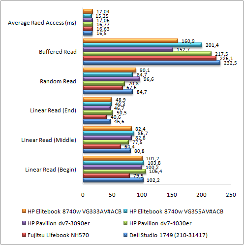 Традиционные графики тестирования накопителей пакета Lavalys было решено заменить обычной сравнительной диаграммой, дабы наглядно продемонстрировать разницу в производительности дисковой подсистемы всех участников тестирования.