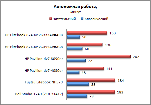 Для возможности сравнения ниже приведёна диаграмма времени автономной работы в режимах «классический» и «читательский» для следующих мобильных ПК: