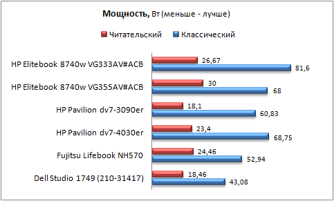 В связи с тем, что оппоненты оснащены аккумуляторами различной емкости, было решено добавить сравнительную диаграмму, демонстрирующую потребление энергии в режимах "классический" и "читательский" пакета Battery Eater Pro.