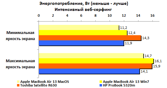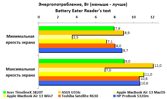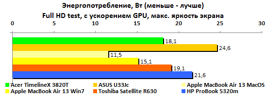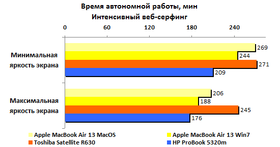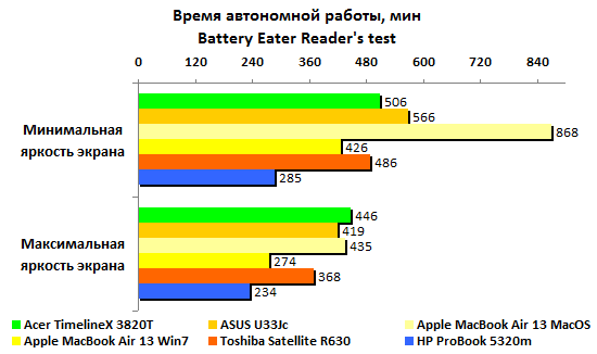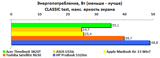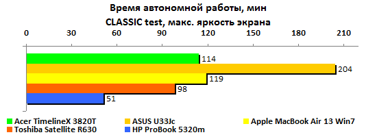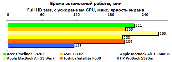 Ожидать при такой емкости аккумулятора выдающихся результатов по части автономной работы, разумеется, не стоит. Никакие чудеса оптимизации энергопотребления — и особенно под Windows — не способны компенсировать малый запас энергии. В HP честно постарались снизить расход, но все равно ProBook 5320m сильно уступает конкурентам. В самом благоприятном случае — минимальная нагрузка, минимальная же подсветка дисплея — он может проработать лишь пять часов без четверти.