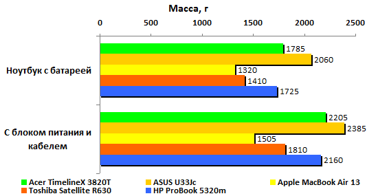 С другой стороны, масса все равно получилась не такой уж маленькой: вместе с аккумулятором ноутбук весит больше 1,7 килограмма. А если добавить к этому блок питания и сетевой кабель, то масса оказывается ощутимо больше двух килограммов. Для «тринашки» без оптического привода и с «обрезанной» батареей это очень даже немало.