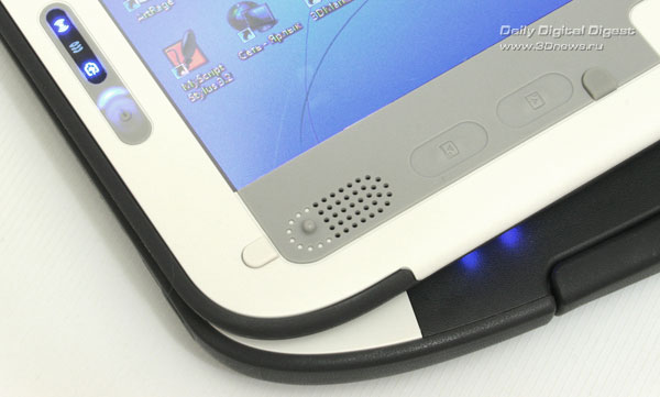 Нетбук является трансформером, поэтому дисплей имеет две степени свободы – раскрытие крышки ограничено углом 180 градусов, а вокруг собственной оси дисплей поворачивается на все 360 градусов. На кромке дисплея установлены клавиши перехода вперёд и назад, а также две программируемые клавиши, которые по умолчанию отвечают за вызов приложений настройки звука и работы с веб-камерой. К слову, камера у нетбука поворотная, что встречается не так часто. Чуть левее дисплея находится клавиша включения и три индикатора активности и состояния (обращение к жёсткому диску, состояние аккумулятора и беспроводной сети). На нижней кромке, помимо клавиш, также находится пара динамиков.