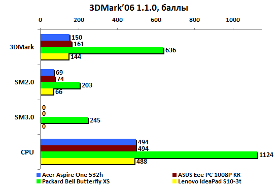 Картина совершенно предсказуемая: результаты трех нетбуков отличаются на считанные очки. Не становится неожиданностью и превосходство CULV-ноутбука над ними.