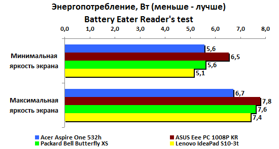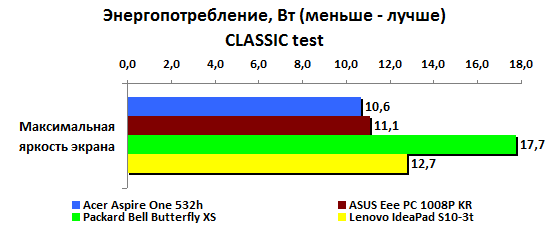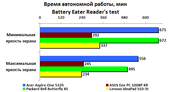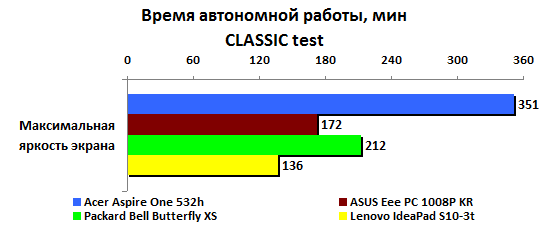 Если же задействовать ресурсы системы на полную катушку, то экран IdeaPAd S10-3t потухнет через два часа с четвертью - пока это самый неудачный результат среди всех протестированных нами нетбуков на процессоре Atom N450.