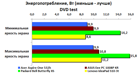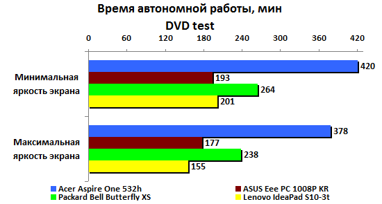 Время воспроизведения фильмов в формате MPEG2 составляет 150-200 минут в зависимости от уровня подсветки экрана. Не так уж мало, в принципе, но ужасно недолго, если сравнивать с Acer Aspire One 532h или MSI Wind U160. Любопытно, что яркость влияет на длительность работы заметно сильнее, чем у конкурентов.