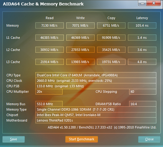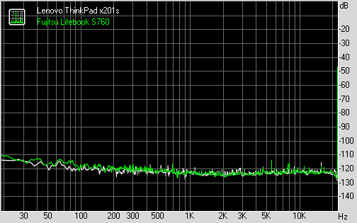 В ThinkPad x201s встроен интегрированный звук Conexant Cx20585. К слову, Lenovo гораздо чаще остальных производителей использует в своих ноутбуках решения Conexant, которые в последнее время начали набирать популярность, отбирая долю у Realtek. Но вернёмся к конкретной модели кодека — о ней нет ни намёка на сайте производителя. Впрочем, такие «секретные» аудиокодеки Conexant в ноутбуках Lenovo — редкость. Найти хоть какие-то характеристики чипа не удалось. Стоит отметить лишь то, что это 4-канальный аудиокодек с поддержкой 24-битного звука и частотой дискретизации до 192 кГц. Тестирование аудиотракта производилось в пакете RightMark Audio Analyzer (далее RMAA) при помощи звукового интерфейса Creative E-MU 0202 USB. Все спецэффекты отключены, настройки эквалайзера выставлены по умолчанию. Перед началом тестирования драйверы аудиокодеков были обновлены до наиболее свежей версии на момент написания материала. В качестве оппонента был выбран мощный малыш от Fujitsu — модель Fujitsu Lifebook S760
